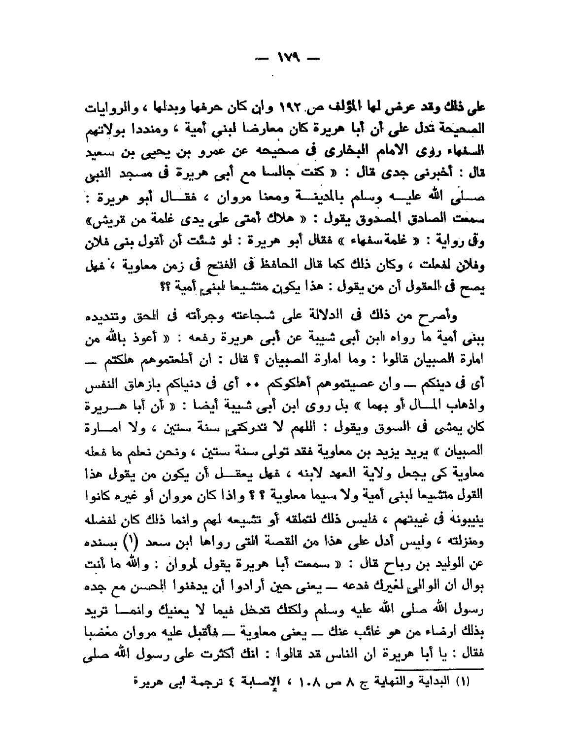 «أَعُوذ بِاَللَّهِ مِنْ إِمَارَة الصِّبْيَان، قَالُوا وَمَا إِمَارَة الصِّبْيَان؟ قَالَ: إِنْ أَطَعْتُمُوهُمْ هَلَكْتُمْ - أَيْ فِي دِينكُمْ - وَإِنْ عَصَيْتُمُوهُمْ أَهْلَكُوكُمْ .. أَيْ فِي دُنْيَاكُمْ بِإِزْهَاقِ النَّفْس أَوْ بِإِذْهَابِ الْمَال أَوْ بِهِمَا» بل روى ابْنُ أَبِي شَيْبَة أيضًا: «أَنَّ أَبَا هُرَيْرَة كَانَ يَمْشِي فِي السُّوق وَيَقُول: اللَّهُمَّ لاَ تُدْرِكنِي سَنَةَ سِتِّينَ وَلاَ إِمَارَةَ الصِّبْيَان» يريد يزيد بن معاوية فقد تولى سَنَةَ ستين ونحن نعلم ما فعله معاوية كي يجعل ولاية العهد لابنه، فهل يعقل أن يكون من يقول هذا القول متشيعًا لبني أمية ولا سيما معاوية؟؟ وإذا كان مروان أو غيره كانوا ينيبونه في غيبتهم، فليس ذلك لتملقه أو تشيعه لهم وإنما ذلك كان لفضله ومنزلته، وليس أدل على هذا من القصة التي رواها ابن سعد (¬1) بسنده عن الوليد بن رباح قال: سمعت أبا هريرة يقول لمروان: «وَاللَّهِ مَا أَنْتَ بوالٍ، وَإِنَّ الوَالِيَ لَغَيْرُكَ فَدَعْهُ - يعني حين أرادوا أن يدفنوا الحسن مع جده رَسُولُ اللهِ - صَلََّى اللهُ عَلَيْهِ وَسَلَّمَ -، وَلَكِنَّكَ تَدَخَّلُ فِيمَا لاَ يَعْنِيكَ، إِنَّمَا تُرِيدُ بِهَذَا إِرْضَاءَ مَنْ هُوَ غَائِبٌ عَنْكَ» - يَعْنِي مُعَاوِيَةَ -