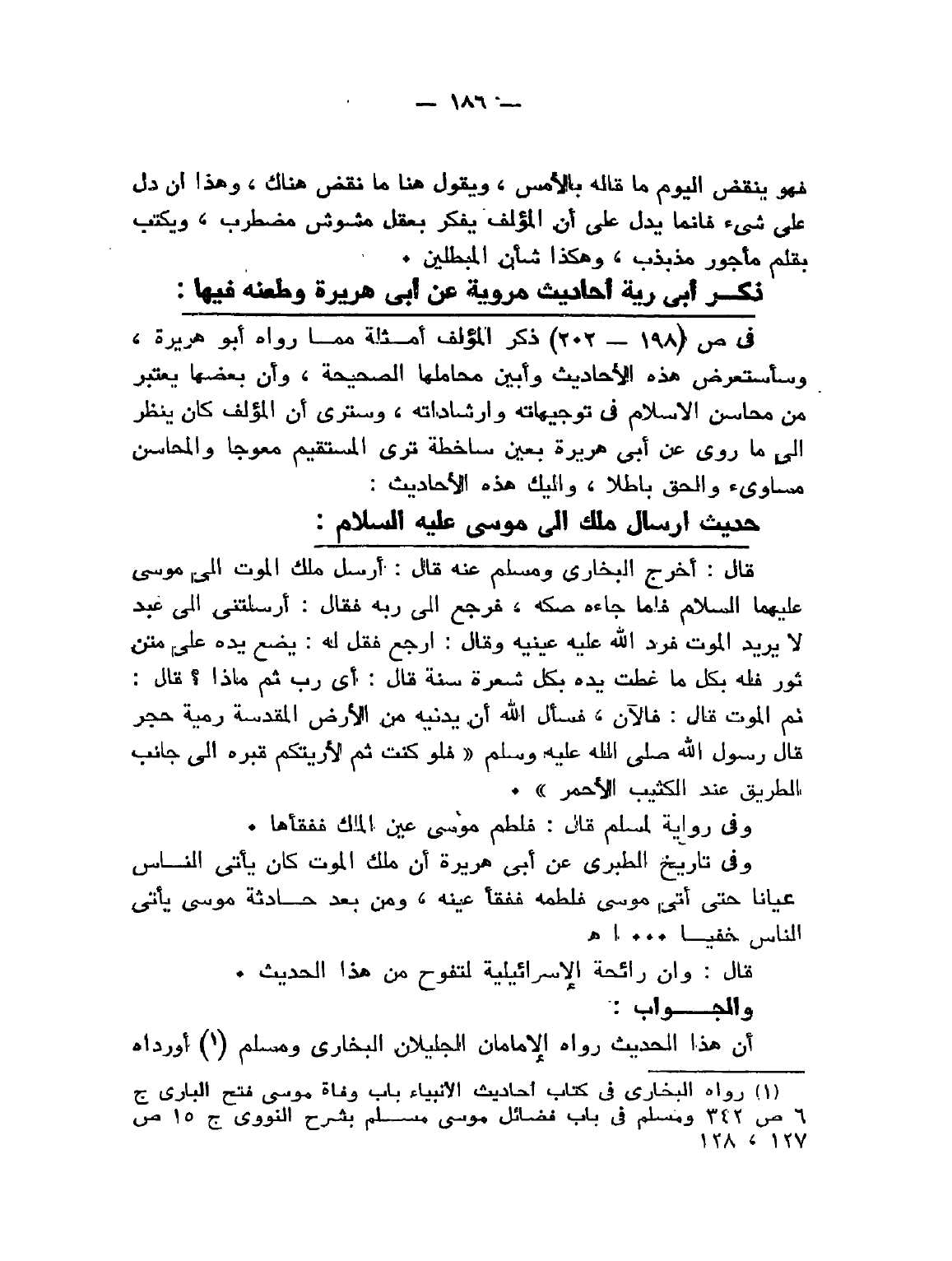 (*) في " صحيح مسلم ": «فَلَمَّا جَاءَهُ صَكَّهُ فَفَقَأَ عَيْنَهُ» وليس كما ذكر أبو رية، انظر " الجامع الصحيح للإمام مسلم " تحقيق وترقيم محمد فؤاد عبد الباقي، (43) كتاب الفضائل (42) باب فضل موسى - صَلََّى اللهُ عَلَيْهِ وَسَلَّمَ -، حديث رقم 2372، 4 / ص 1842، الطبعة الثانية: 1972 م، نشر دار إحياء التراث العربي. بيروت - لبنان.