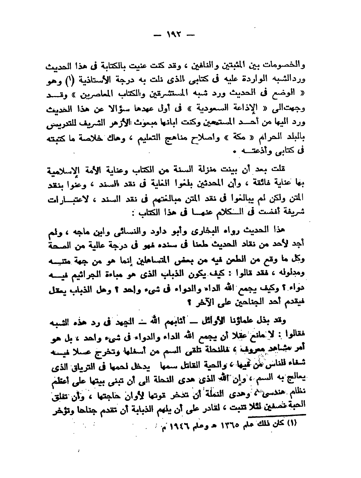 والخصومات بين المُثْبِتِينَ وَالنَّافِينَ، وقد كنت عنيت بالكتابة في هذا الحديث وَرَدِّ الشُّبَهِ الواردة عليه في كتابي الذي نلت به درجة الأستاذية (¬1) وهو " الوَضْعُ فِي الحَدِيثِ وَرَدِّ شُبَهِ المُسْتَشْرِقِينَ وَالكُتَّابِ المُعَاصِرِينَ " وَقَدْ وَجَّهَتْ إِلَيَّ «الإذاعة السعودية» في أول عهدها سؤالاً عن هذا الحديث وَرَدَ إليها من أحد المستمعين وكنت إبانها مبعوث الأزهر الشريف للتدريس بالبلد الحرام «مكة» وإصلاح مناهج التعليم، وهاك خلاصة ما كتبته في كتابي وأذعته.