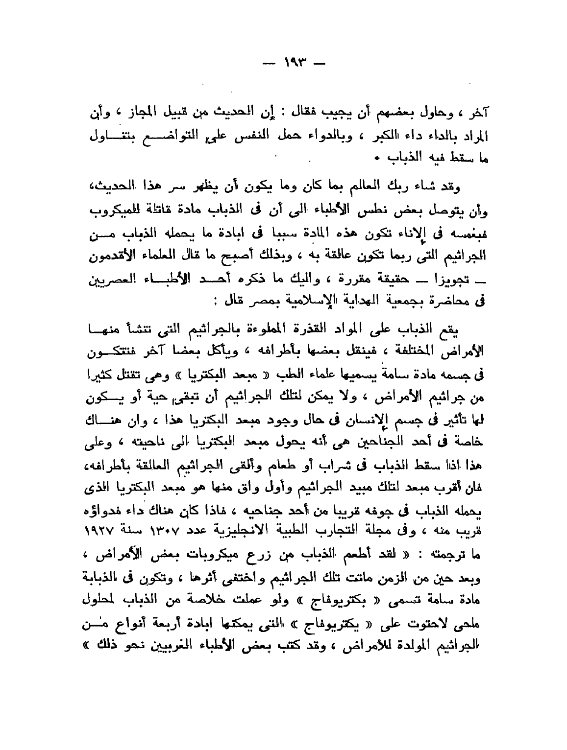 وقد شاء ربك العالم بما كان وما يكون أن يظهر سِرُّ هذا الحديث، وأن يتوصل بعض نطس الأطباء إلى أن في الذباب مادة قاتلة للميكروب فبغمسه في الإناء تكون هذه المادة سَبَبًا في إبادة ما يحمله الذباب من الجراثيم التي ربما تكون عالقة به، وبذلك أصبح ما قال العلماء الأقدمون - تجويزًا - حقيقة مقررة، وإليك ما ذكره أحد الأطباء العصريين في محاضرة بجمعية الهداية الإسلامية بمصر قال: