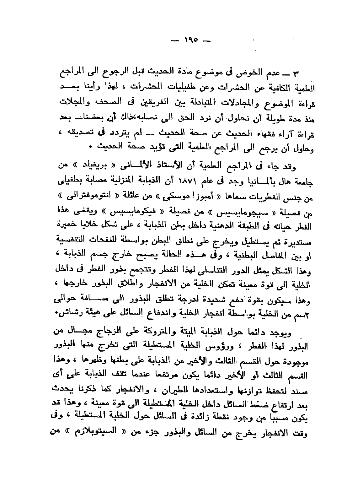 3 - عدم الخوض في موضوع مادة الحديث قبل الرجوع إلى المراجع العلمية الكافية عن الحشرات وعن طفيليات الحشرات، لهذا رأينا بعد قراءة الموضوع والمجادلات المتبادلة بين الفريقين في الصحف والمجلات منذ مدة طويلة أن نحاول أن نرد الحق إلى نصابه، ذلك أن بعضنا - بعد قراءة آراء فقهاء الحديث عن صحة الحديث - لم يتردد في تصديقه، وحاول أن يرجع إلى المراجع العلمية التي تؤيد صحة الحديث.