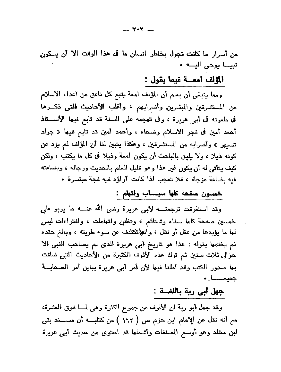وقد استغرقت ترجمته لأبي هريرة - رَضِيَ اللهُ عَنْهُ - ما يربو على خمسين صفحة كلها سفاه وشتائم، وتظنن واتهامات، وافتراءات ليس لها ما يؤيدها من عقل أو نقل، وإنما تكشف عن سوء طويته، وبلغ حقده ثم يختمها بقوله: هذا هو تاريخ أبي هريرة الذي لم يصاحب النَّبِيَّ إِلاَّ حوال ثلاث سنين ثم ترك هذه الألوف الكثيرة من الأحاديث التي ضاقت بها صدور الكتب وقد أطلنا فيها لأن أمر أبي هريرة يباين أمر الصحابة جميعًا.