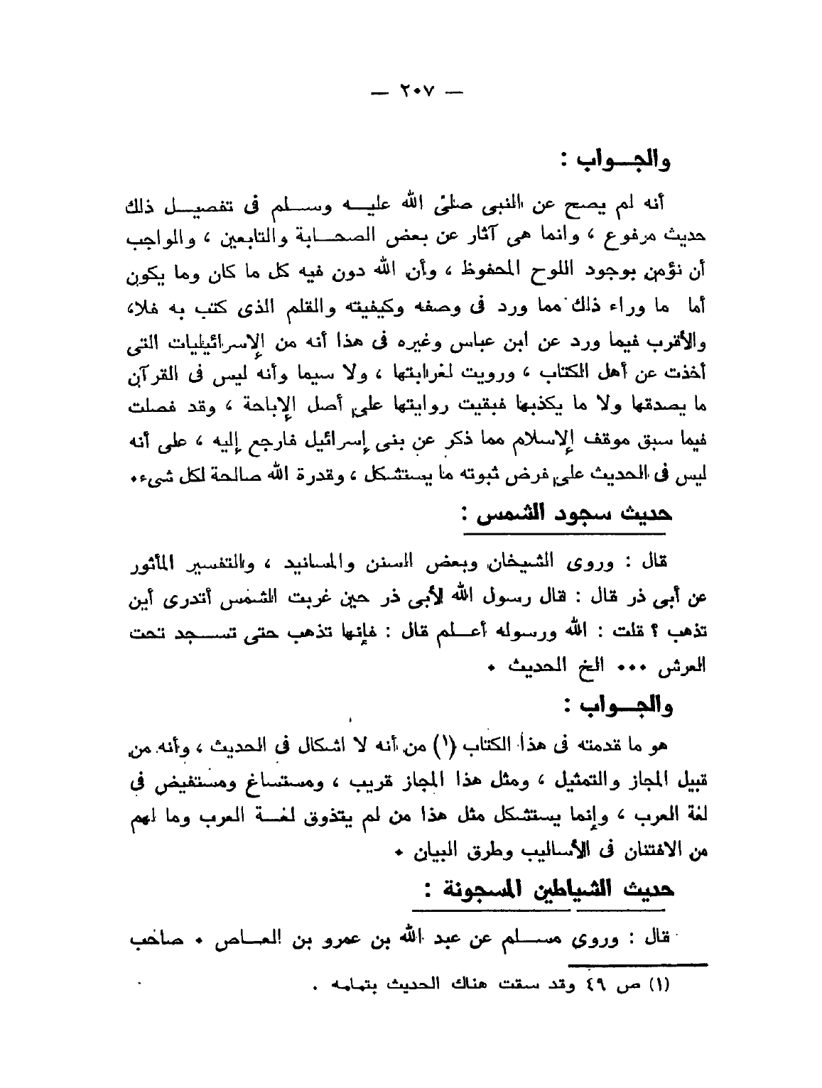قال: وروى الشيخان وبعض السنن والمسانيد، والتفسير المأثور عن أبي ذر قال: قَالَ رَسُولُ اللهِ لأَبِي ذَرٍّ حِينَ غَرَبَتِ الشَّمْسُ «أَتَدْرِي أَيْنَ تَذْهَبُ؟»، قُلْتُ: اللَّهُ وَرَسُولُهُ أَعْلَمُ، قَالَ: «فَإِنَّهَا تَذْهَبُ حَتَّى تَسْجُدَ تَحْتَ العَرْشِ ... » إلخ الحديث.