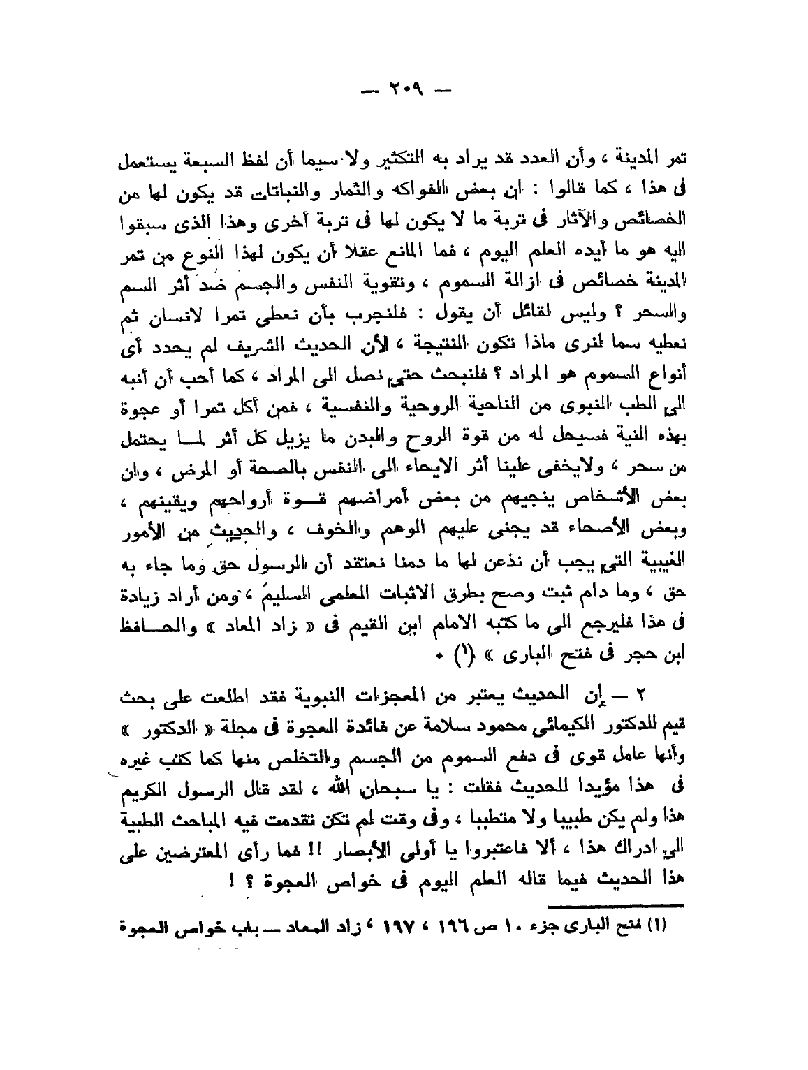 تمر المدينة، وأن العدد قد يراد به التكثير ولا سيما أن لفظ السبعة يستعمل في هذا، كما قالوا: إن بعض الفواكه والثمار والنباتات قد يكون لها من الخصائص والآثار في تربة ما لا يكون لها في تربة أخرى، وهذا الذي سبقوا إليه هو ما أيده العلم اليوم، فما المانع عقلاً أن يكون لهذا النوع من تمر المدينة خصائص في إزالة السموم، وتقوية النفس والجسم ضد أثر السم والسحر؟ وليس لقائل أن يقول: فلنجرب بأن نعطي تَمْرًا لإنسان ثم نعطيه سُمًّا لنرى ماذا تكون النتيجة، لأنَّ الحديث الشريف لم يحدد أي أنواع السموم هو المراد؟ فلنبحث حتى نصل إلى المراد، كما أحب أَنْ أُنَبِّهَ إلى أثر الطب النبوي من الناحية الروحية والنفسية، فمن أكل تَمْرًا أو عجوة بهذه النية فسيحصل له من قوة الروح والبدن ما يزيل كل أثر لما يحتمل من سحر، ولا يخفى علينا أثر الإيحاء إلى النفس بالصحة أو المرض، وإن بعض الأشخاص ينجيهم من بعض أمراضهم قوة أرواحهم ويقينهم، وبعض الأصحاء قد يجني عليهم الوهم والخوف، والحديث من الأمور الغيبية التي يجب أن نذعن لها ما دمنا نعتقد أن الرسول حق وما جاء به حق، وما دام ثبت وصح بطرق الإثبات العلمي السليم، ومن أراد زيادة في هذا فليرجع إلى ما كتبه الإمام ابن القيم في " زاد المعاد " والحافظ ابن حجر في " فتح الباري " (¬1).