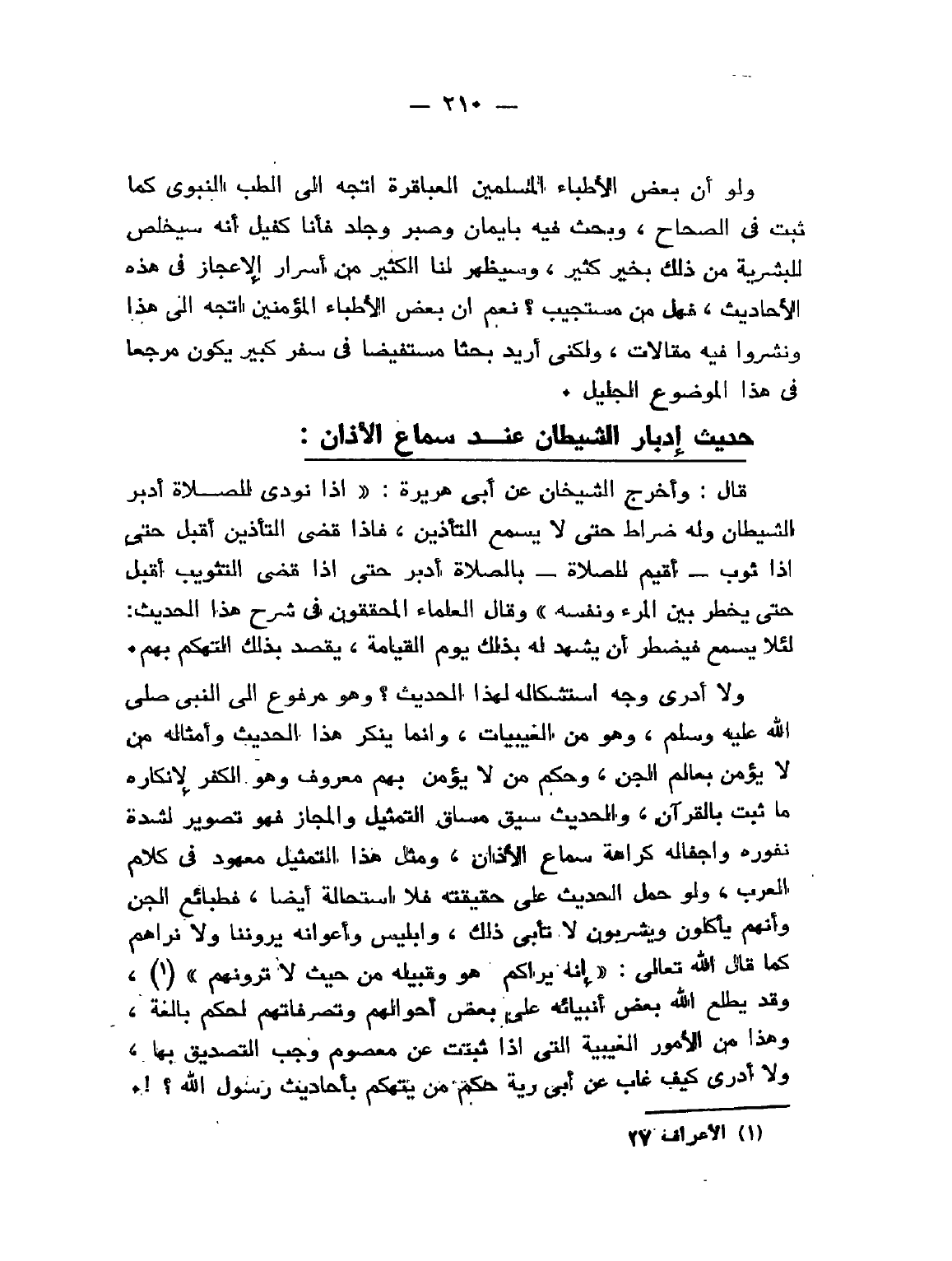 ولو أن بعض الأطباء المسلمين العباقرة اتجه إلى الطب النبوي كما ثبت في الصحاح، وبحث فيه بإيمان وصبر وَجَلَدٍ فأنا كفيل أنه سيخلص للبشرِيَّةَ من ذلك بخير كثير، وسيظهر لنا الكثير من أسرار الإعجاز في هذه الأحاديث، فهل من مستجيب؟ نعم إن بعض الأطباء المؤمنين اتجه إلى هذا ونشروا فيه مقالات، ولكني أريد بَحْثًا مُسْتَفِيضًا في سفر كبير يكون مرجعًا في هذا الموضوع الجليل.