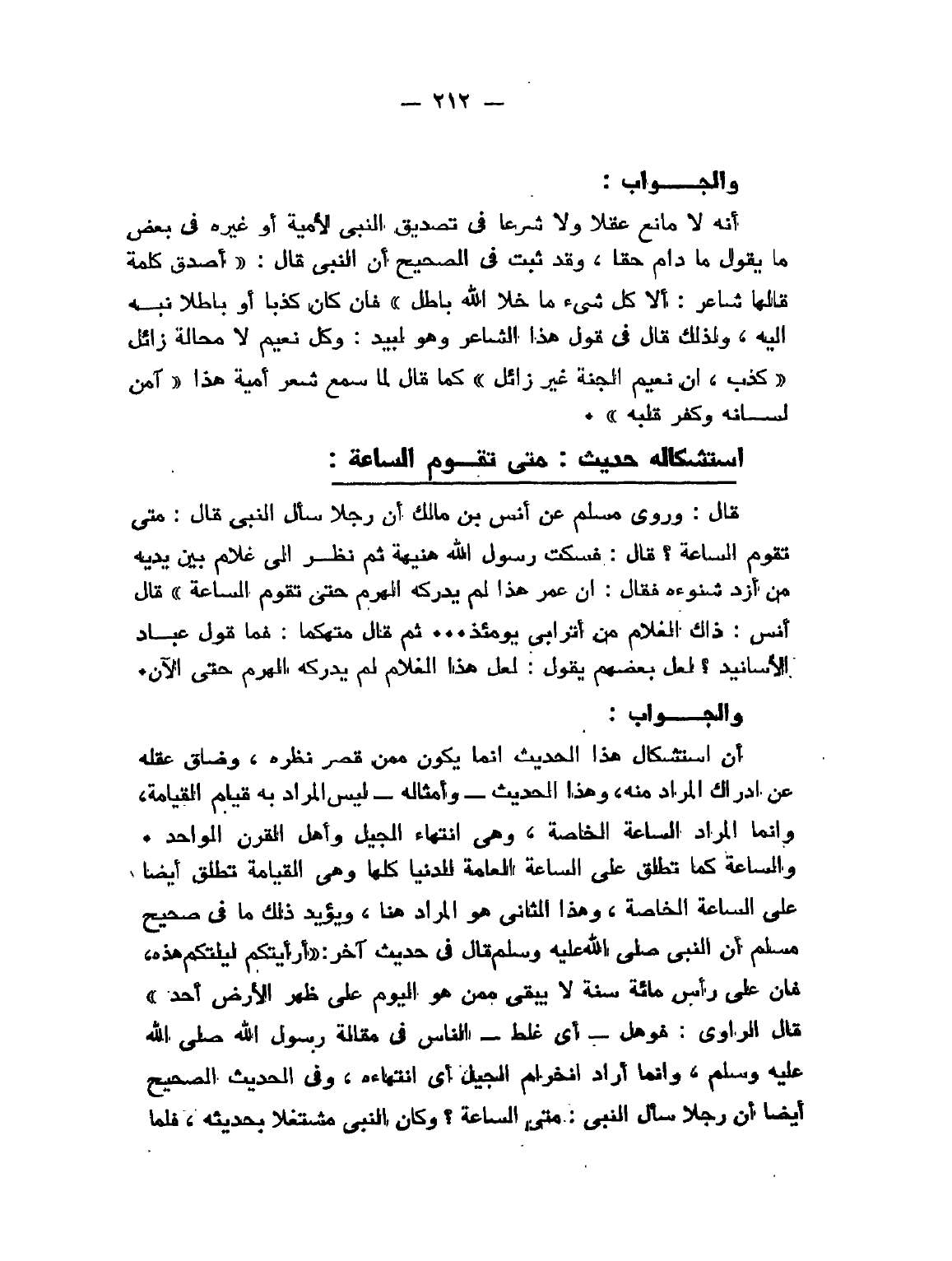 قَالَ: وَرَوَى " مسلم " عَنْ أَنَسِ بْنِ مَالِكٍ، أَنَّ رَجُلاً سَأَلَ النَّبِيَّ صَلَّى اللهُ عَلَيْهِ وَسَلَّمَ، قَالَ: مَتَى تَقُومُ السَّاعَةُ؟ قَالَ: فَسَكَتَ رَسُولُ اللهِ صَلَّى اللهُ عَلَيْهِ وَسَلَّمَ هُنَيْهَةً، ثُمَّ نَظَرَ إِلَى غُلاَمٍ بَيْنَ يَدَيْهِ مِنْ أَزْدِ شَنُوءَةَ، فَقَالَ: «إِنْ عُمِّرَ هَذَا، لَمْ يُدْرِكْهُ الْهَرَمُ حَتَّى تَقُومَ السَّاعَةُ» قَالَ: قَالَ أَنَسٌ: ذَاكَ الْغُلاَمُ مِنْ أَتْرَابِي يَوْمَئِذٍ ... ثم قال متهكما: فما قول عُبَّادِ الأسانيد؟ لعل بعضهم يقول: لعل هذا الغلام لم يدركه الهرم إلى الآن.
