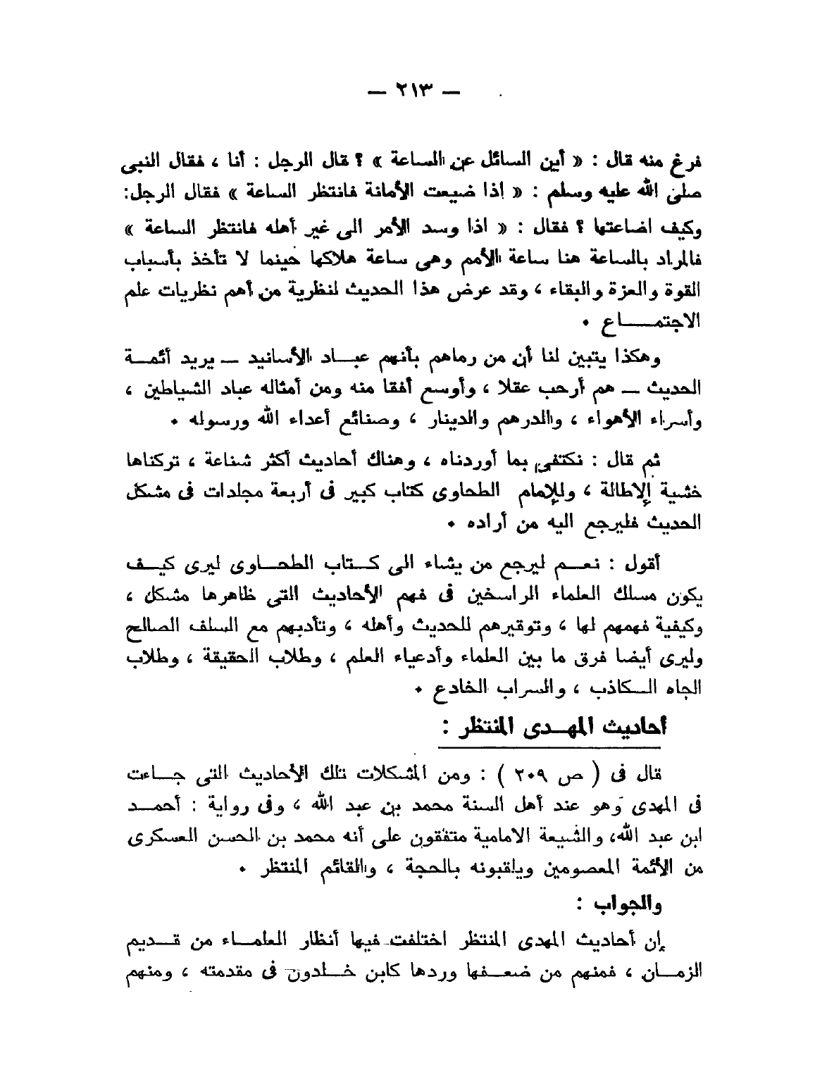 قال في [ص 209]: ومن المشكلات تلك الأحاديث التي جاءت في المهدي وهو عند أَهْلِ السُنَّةِ محمد بن عبد الله، وفي رواية: أحمد بن عبد الله، والشيعة الإمامية متفقون على أنه محمد بن الحسن العسكري من الأئمة المعصومين ويلقبونه بِالحُجَّةِ، والقائم المنتظر.