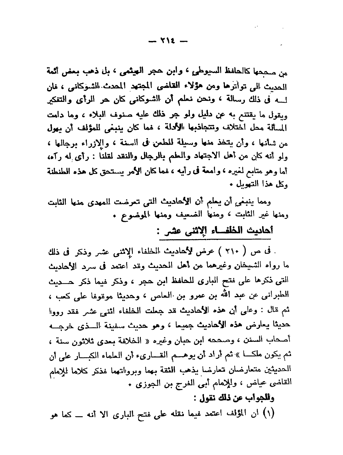 في [ص 210] عرض لأحاديث الخلفاء الاثني عشر وذكر في ذلك ما رواه الشيخان وغيرهما من أهل الحديث وقد اعتمد في سرد الأحاديث التي ذكرها على " فتح الباري " للحافظ ابن حجر، وذكر فيما ذكر حديث " الطبراني " عن عبد الله بن عمرو بن العاص، وحديثًا موقوفًا على كعب، ثم قال: وعلى أن هذه الأحاديث قد جعلت الخلفاء اثني عشر فقد رَوَوْا حَدِيثًا يعارض هذه الأحاديث جميعًا، وهو حديث سَفِينَةَ الذي خرجه أصحاب السنن، وَصَحَّحَهُ ابن حبان وغيره «الخِلاَفَةُ بَعْدِي ثَلاَثُونَ سَنَةً ثُمَّ يَكُونُ مُلْكًا» ثم أراد أن يوهم القارئ أن العلماء الكبار على أن الحديثين متعارضان تعارضًا يذهب الثقة بهما وبرواتهما فذكر كلاما للإمام القاضي عياض، وللإمام أبي الفرج بن الجوزي.