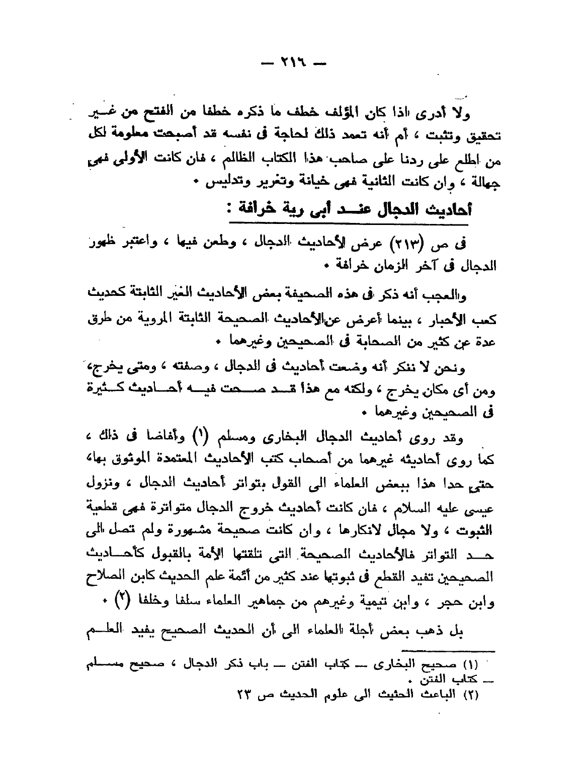 في [ص 213] عرض لأحاديث الدَجَّالِ، وطعن فيها، واعتبر ظهور الدجال في آخر الزمان خرافة. والعجب أنه ذكر في هذه الصحيفة بعض الأحاديث الغير ثابتة كحديث كعب الأحبار، بينما أعرض عن الأحاديث الصحيحة الثابتة المروية من طرق عدة عن كثير من الصحابة في " الصحيحين " وغيرهما.