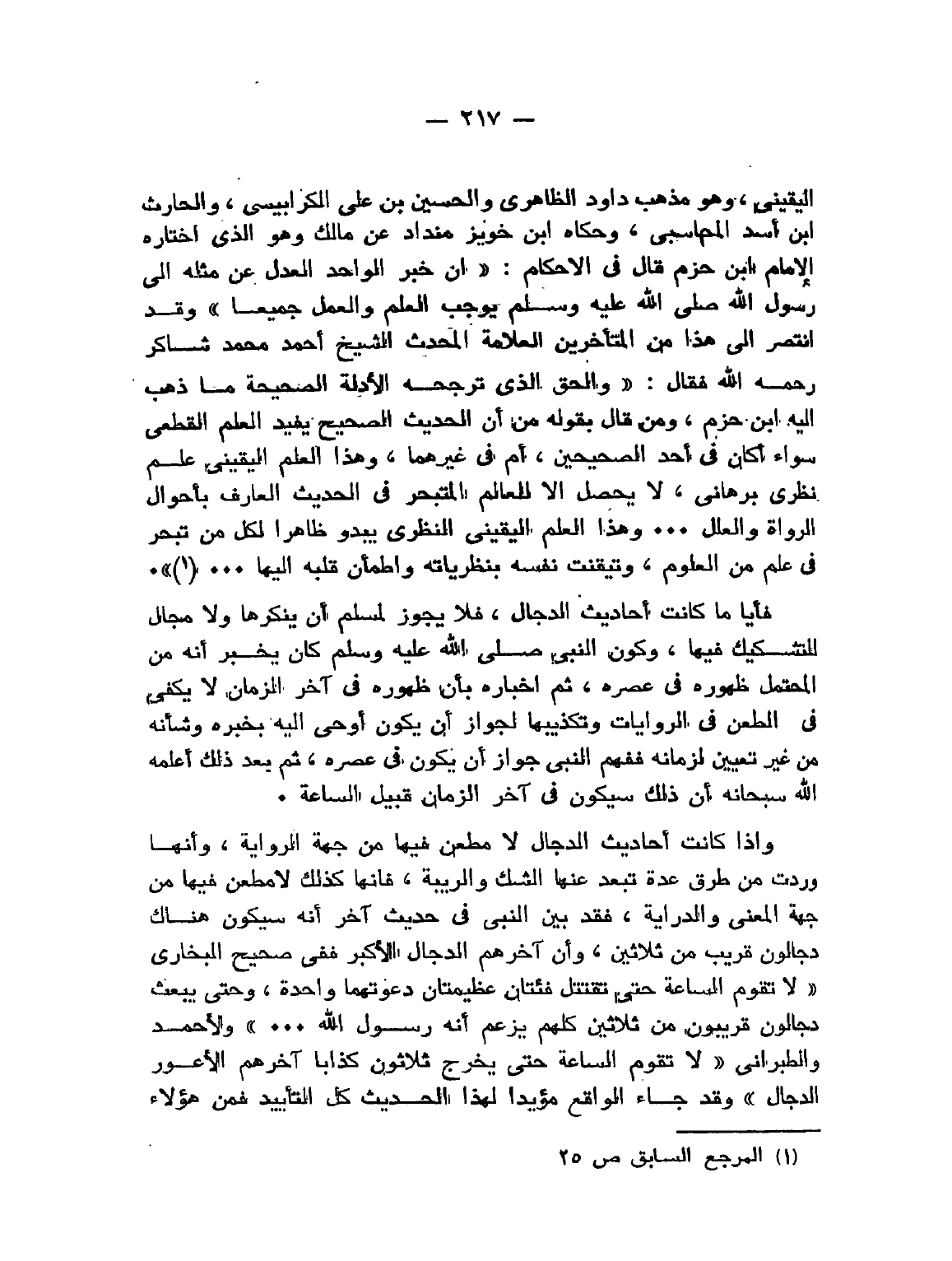 فأيا ما كانت أحاديث الدجال، فلا يجوز لمسلم أن ينكرها ولا مجال للتشكيك فيها، وكون النَّبِيِّ - صَلََّى اللهُ عَلَيْهِ وَسَلَّمَ - كان يخبر أنه من المحتمل ظهوره في عصره، ثم إخباره بأن ظهوره في آخر الزمان لا يكفي في الطعن في الروايات وتكذيبها لجواز أن يكون أوحى إليه بخبره وشأنه من غير تعيين لزمانه ففهم النَّبِيُّ جواز أن يكون في عصره، ثم بعد ذلك أعلمه الله - سُبْحَانَهُ - أن ذلك سيكون في آخر الزمان قبيل الساعة.