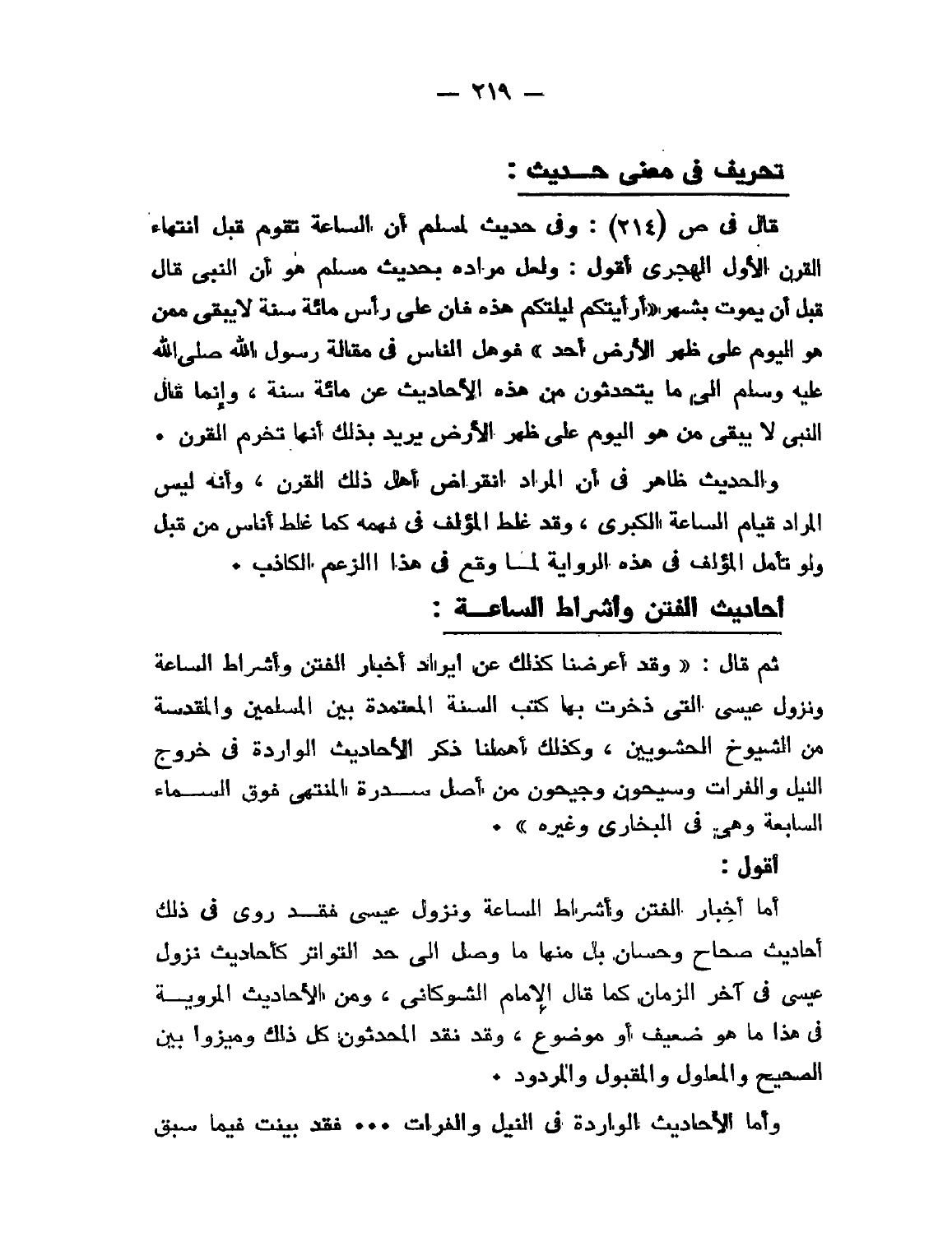 قال في [ص 214]: وفي حديث لـ " مسلم " أن الساعة تقوم قبل انتهاء القرن الأول الهجري أقول: ولعل مراده بحديث " مسلم " هو أن النَّبِي قال قبل أن يموت بشهر «أَرَأَيْتَكُمْ لَيْلَتَكُمْ هذِهِ؟ فَإِنَّ عَلَى رَأْسَ مِائَةِ سَنَةٍ، لاَ يَبْقَى، مِمَّنْ هُوَ اليَوْمَ عَلَى ظَهْرِ الأَرْضِ، أَحَدٌ» فَوَهَلَ الناس في مقالة رسول الله - صَلََّى اللهُ عَلَيْهِ وَسَلَّمَ - إلى ما يتحدثون من هذه الأحاديث عن مائة سَنَةٍ، وإنما قال النَّبِي لا يبقى مِمَّنْ هو اليوم على ظهر الأرض يريد بذلك أنها تخرم القرن.