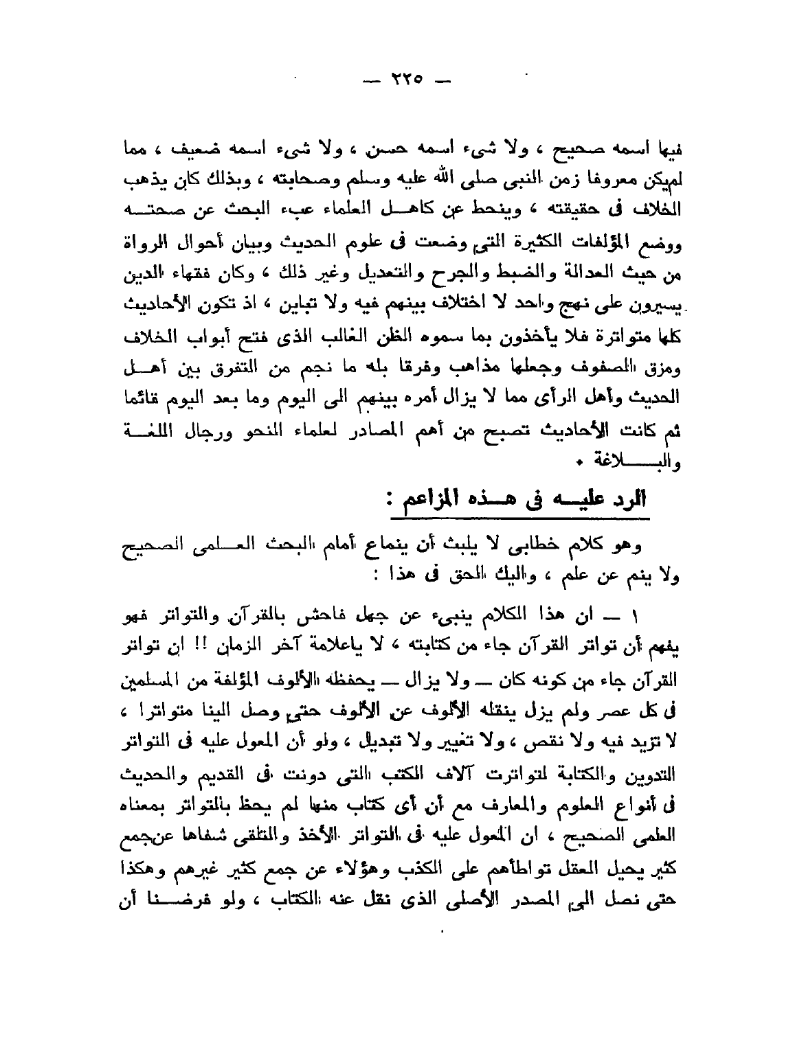 فيها اسمه صحيح، ولا شيء اسمه حسن، ولا شيء اسمه ضعيف، مِمَّا لم يكن معروفًا زمن النَّبِيِّ - صَلََّى اللهُ عَلَيْهِ وَسَلَّمَ - وصحابته، وبذلك كان يذهب الخلاف في حقيقته، وينحط عن كاهل العلماء عِبْءُ البحث عن صحته ووضع المؤلفات الكثيرة التي وضعت في علوم الحديث وبيان أحوال الرواة من حيث العدالة والضبط والجرح والتعديل وغير ذلك، وكان فقهاء الدين يسيرون على نهج واحد لا اختلاف بينهم فيه ولا تباين، إذ تكون كلها متواترة فلا يأخذون بما سموه الظن الغالب الذي فتح أبواب الخلاف ومزق الصفوف وجعلها مذاهب وفرقًا بَلْهَ ما نجم من التفرق بين أهل الحديث وأهل الرأي مِمَّا لا يزال أمره بينهم إلى اليوم وما بعد اليوم قائمًا، ثم كانت الأحاديث تصبح من أهم المصادر لعلماء النحو ورجال اللغة والبلاغة