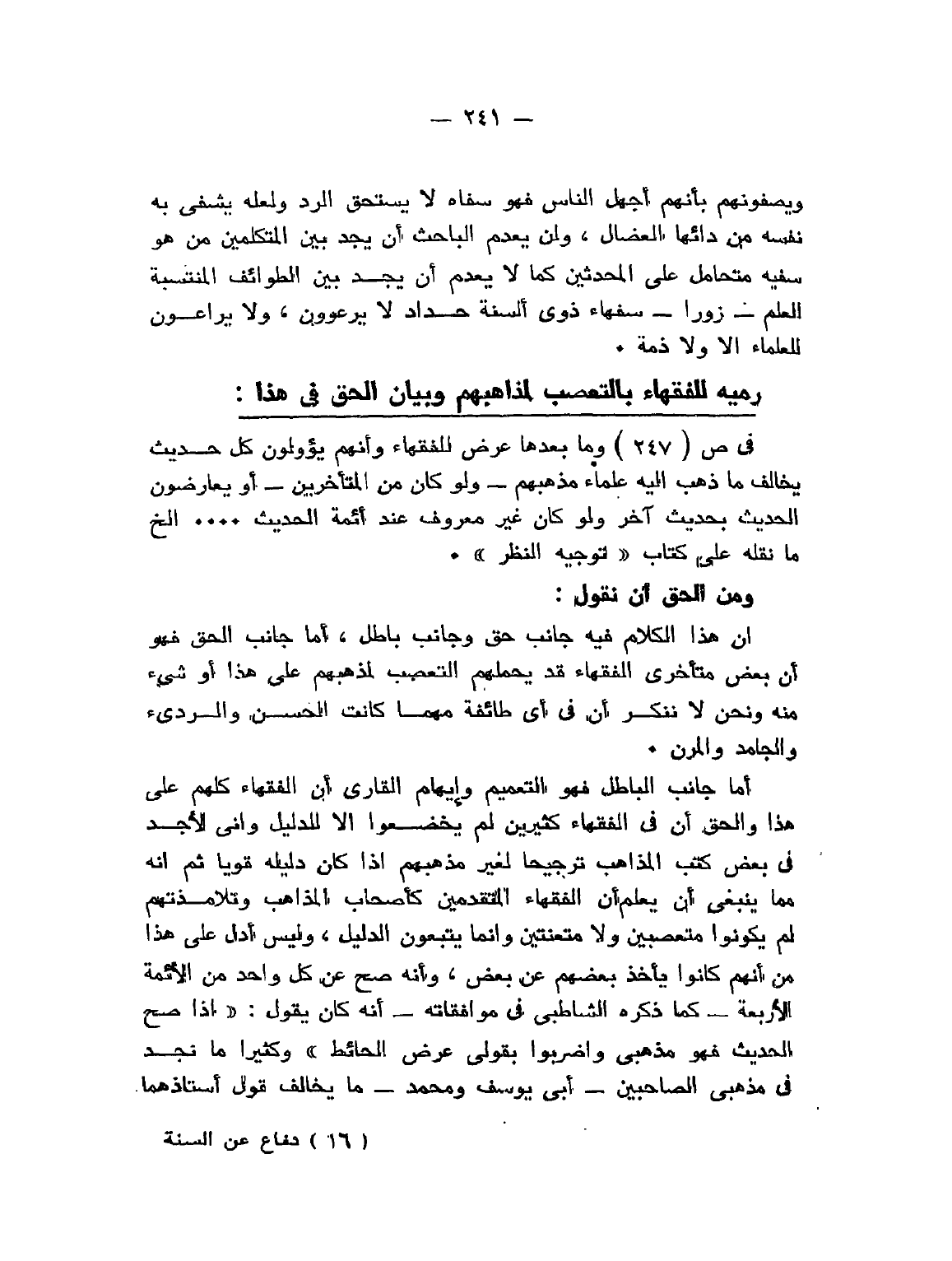 في [ص 247] وما بعدها عرض للفقهاء وأنهم يؤولون كل حديث يخالف ما ذهب إليه علماء مذهبهم - ولو كان من المُتَأَخِّرِينَ - أو يعارضون الحديث بحديث آخر ولو كان غير معروف عند أئمة الحديث .... إلخ ما نقله على كتاب " توجيه النظر ".