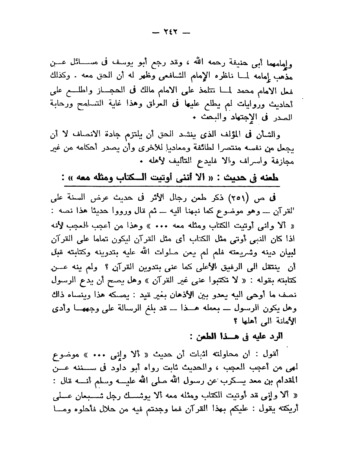 في [ص 251] ذكر طعن رجال الأثر في حديث عرض السُنَّة على القرآن - وهو موضوع كما نبهنا إليه - ثم قال ورووا حديثا هذا نصه: «ألا وإني أوتيت الكتاب ومثله معه ... » وهذا من أعجب العجب لأنه إذا كان النَّبِيِّ أوتي مثل الكتاب أي مثل القرآن ليكون تمامًا على القرآن لبيان دينه وشريعته فلم لم يعن - صَلَوَاتُ اللهِ وَسَلاَمُهُ عَلَيْهِ - بتدوينه وكتابته قبل أن ينتقل إلى الرفيق الأعلى كما عني بتدوين القرآن؟ ولم ينه عن كتابته بقوله: «لاَ تَكْتُبُوا عَنِّي غَيْرَ القُرْآنِ» وهل يصح أن يدع الرسول نصف ما أوحي إليه يعدو بين الأذهان بغير قيد: يمسكه هذا وينساه ذاك وهل يكون الرسول - بعمله هذا - قد بَلَّغَ الرسالة على وجهها وأدى الأمانة إلى أهلها؟