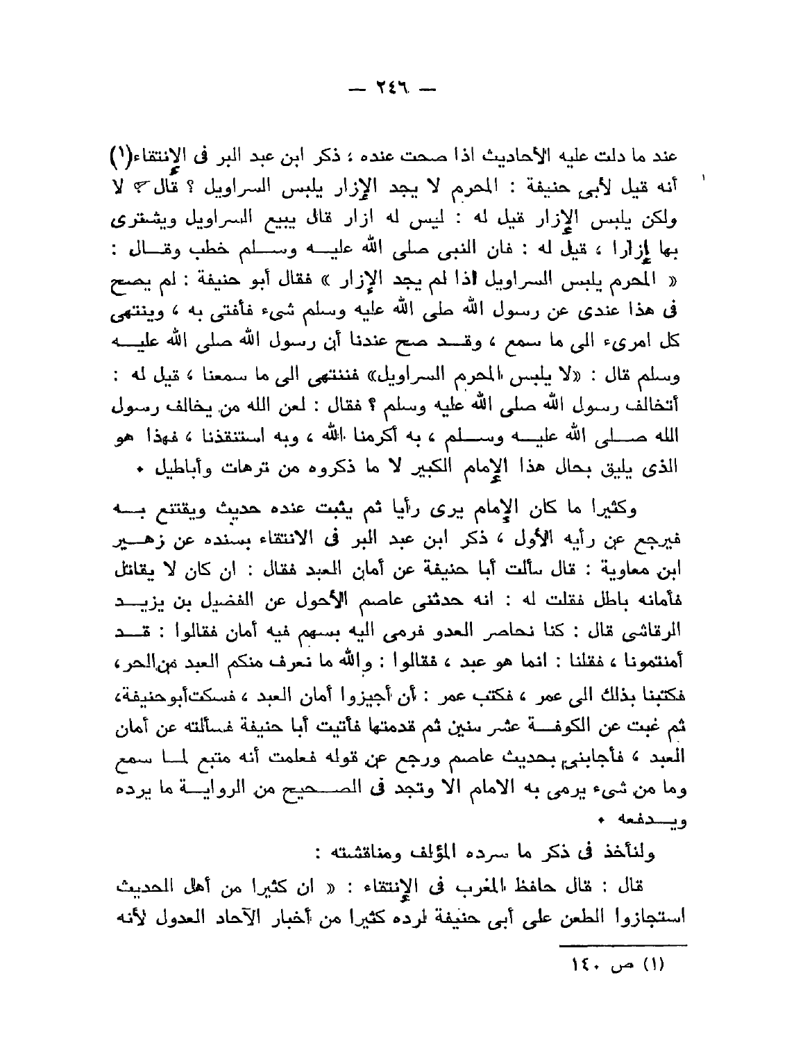 قال: قال حافظ المغرب في " الانتقاء ": «كَثِيرٌ مِنْ أَهْلِ الْحَدِيثِ اسْتَجَازُوا الطَّعْنَ عَلَى أَبِي حَنِيفَةَ لِرَدِّهِ كَثِيرًا مِنْ أَخْبَارِ الآحَادِ الْعُدُولِ لأَنَّهُ