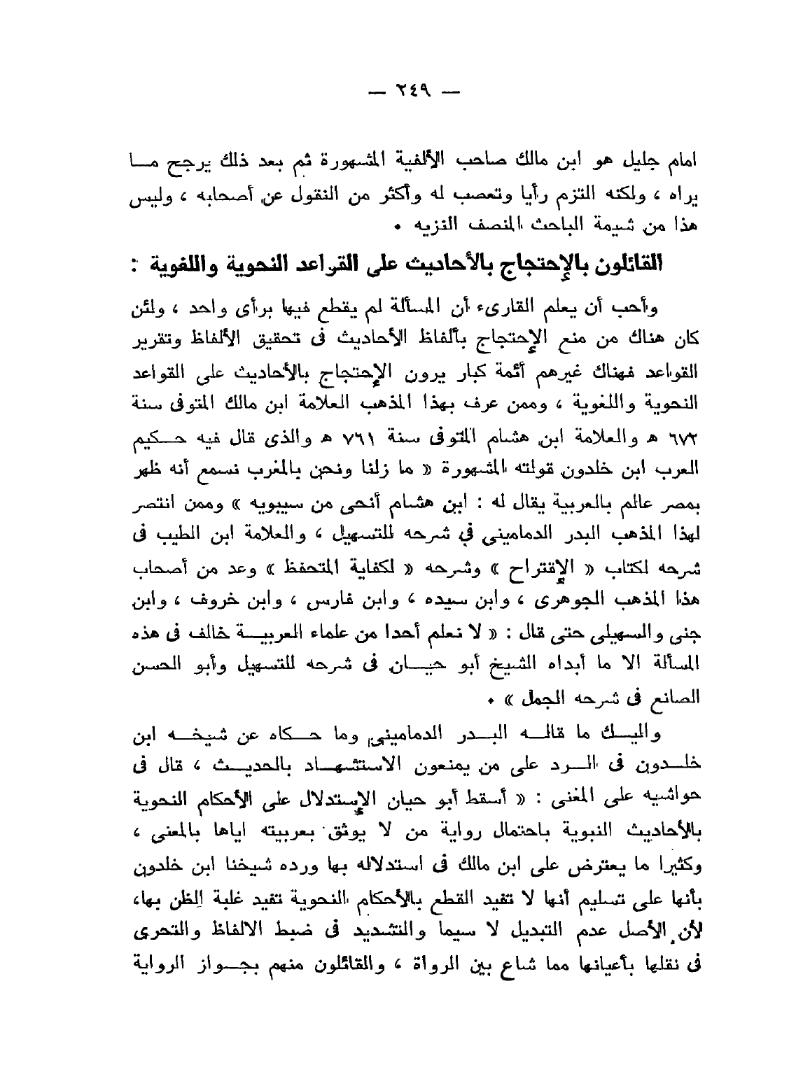 إمام جليل هو ابن مالك صاحب " الألفية " المشهورة ثم ذلك بعد ما يرجح ما يراه ولكنه التزم رَأْيًا وتعصب وأكثر من النقول عن أصحابه، وليس هذا من شيمة الباحث المُنْصِفِ النَّزِيهِ.