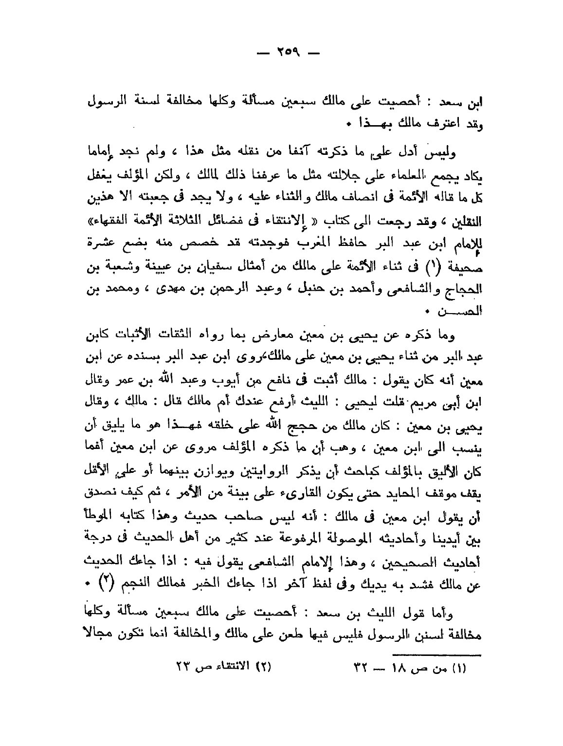 وليس أدل على ما ذكرته لك آنِفًا من نقله مثل هذا، ولم نجد إمامًا يكاد يجمع العلماء على جلالته مثل ما عرفنا ذلك لمالك، ولكن المؤلف يغفل كل ما قاله الأئمة في إنصاف مالك والثناء عليه، ولا يجد في جعبته إِلاَّ هذين النقلين، وقد رجعت إلى كتاب " الانتقاء في فضائل الثلاثة الأئمة الفُقَهَاء " للإمام ابن عبد البر حافظ المغرب فوجدته قد خصص منه بضع عشرة صحيفة (¬1) في ثناء الأئمة على مالك من أمثال سفيان بن عُيينة وشعبة بن الحجاج والشافعي وأحمد بن حنبل، وعبد الرحمن بن مهدي، ومحمد بن الحسن.