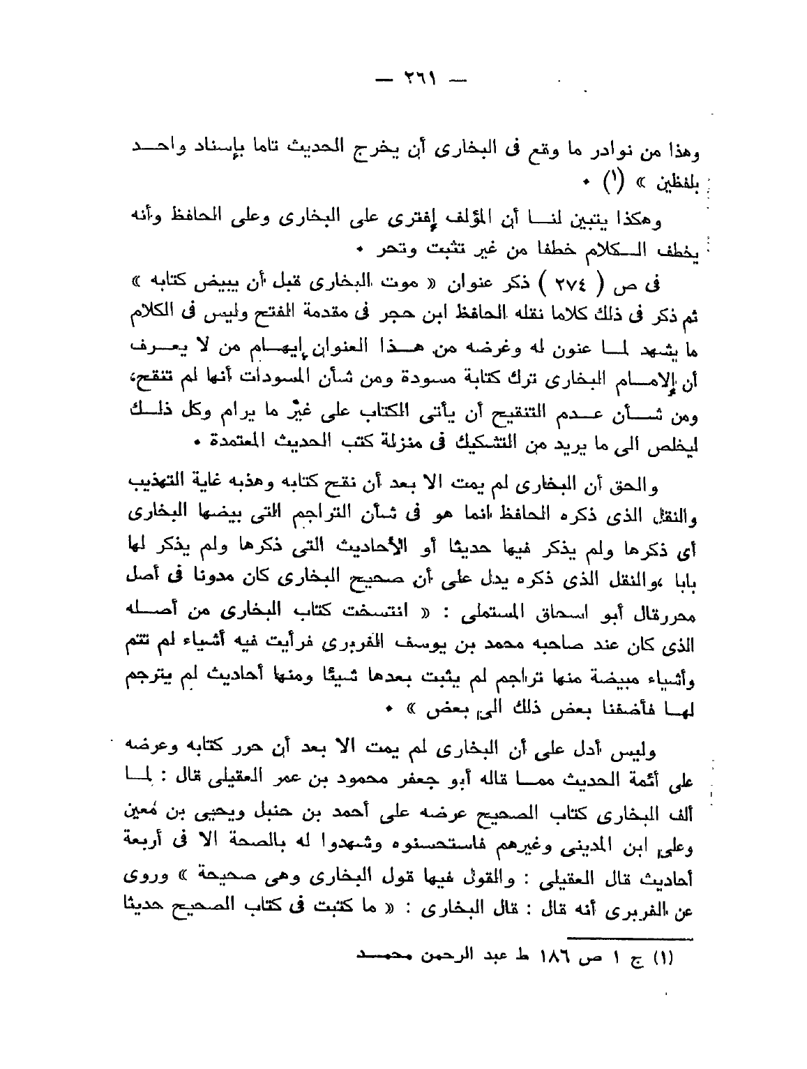 في [ص 274] ذكر عنوان «موت البخاري قبل أن يبيض كتابه» ثم ذكر في ذلك كلامًا نقله الحافظ ابن حجر في مقدمة " الفتح " وليس في الكلام ما يشهد لِمَا عَنْوَنَ له وغرضه من هذا العنوان إيهام من لا يعرف أن الإمام البخاري ترك كتابه مسودة ومن شأن المسودات أنها لم تنقح، ومن شأن عدم التنقيح أن يأتي الكتاب على غير ما يرام وكل ذلك ليخلص إلى ما يريد من التشكيك في منزلة كتب الحديث المعتمدة.