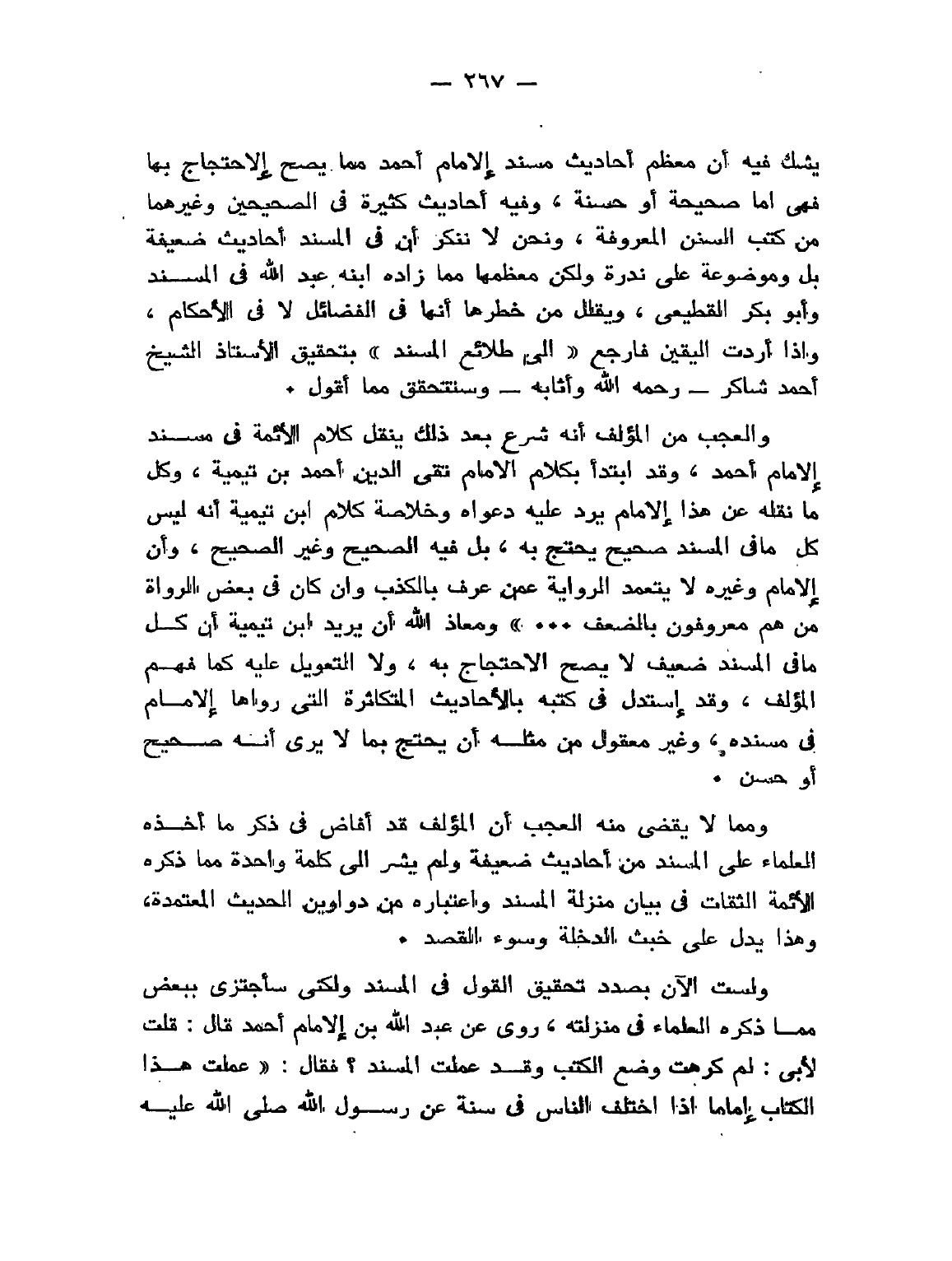 والعجب من المؤلف أنه شرع بعد ذلك ينقل كلام الأئمة في " مسند الإمام أحمد "، وقد ابتدأ بكلام الإمام تقي الدين أحمد بن تيمية، وكل ما نقله عن هذا الإمام يَرُدُّ عليه دعواه وخلاصة كلام ابن تيمية أنه ليس كل ما في " المسند " صحيح يحتج به، بل فيه الصحيح وغير الصحيح، وأن الإمام وغيره لا يعتمد الرواية عمن عرف بالكذب وإن كان في بعض الرواة من هم معروفون بالضعف .... » ومعاذ الله أن يريد ابن تيمية أن كل ما في " المسند " ضعيف لا يصح الاحتجاج به، ولا التعويل عليه كما فهم المؤلف، وقد استدل في كتبه بالأحاديث المتكاثرة التي رواها الإمام في " مسنده "، وغير معقول من مثله أن يحتج بما لا يرى أنه صحيح أو حسن.