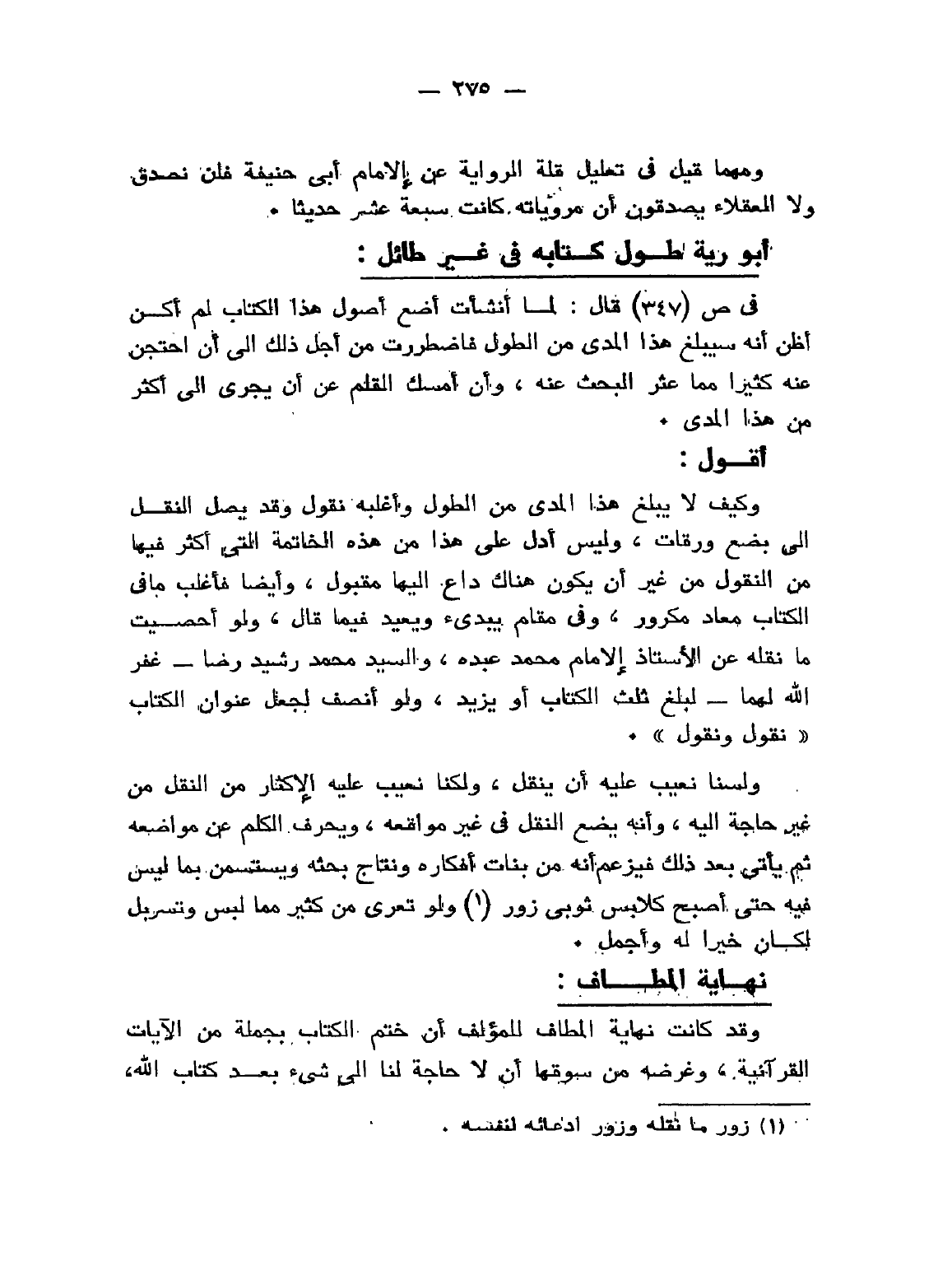 وكيف لا يبلغ هذا المدى من الطول وأغلبه نقول وقد يصل النقل إلى بضع ورقات، وليس أدل على هذا من هذه الخاتمة التي أكثر فيها من النقول من غير أن يكون هناك داع إليها مقبول، وأيضًا فأغلب ما في الكتاب مُعَادٌ مَكْرُورٌ، وفي كل مقام يبدئ ويعيد فيما قال، ولو أحصيت ما نقله عن الأستاذ الإمام محمد عبده، والسيد محمد رشيد رضا - غَفَرَ اللهُ لَهُمَا - لبلغ ثلث الكتاب أو يزيد، ولو أنصف لجعل عنوان الكتاب «نقول ونقول».
