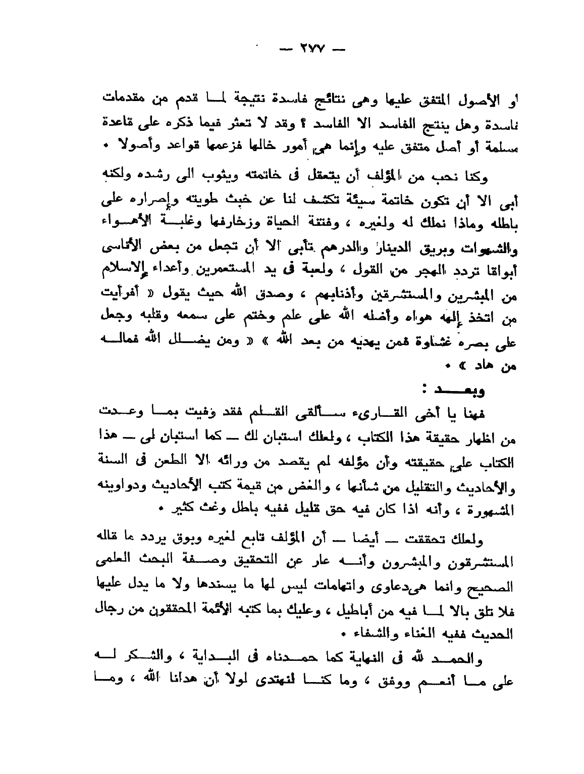 وكنا نحب من المؤلف أن يتعقل في خاتمته ويثوب إلى رشده، ولكنه أَبَى إِلاَّ أن تكون خاتمة سيئة تكشف لنا عن خبث طويته، وإصراره على باطله وماذا نملك له ولغيره، وفتنة الحياة وزخارفها وغلبة الأهواء والشهوات، وبريق الدينار والدرهم تأبى إِلاَّ أن تجعل من بعض الأناسي أَبْوَاقًا تردد الهجر من القول، ولعبة في يد المستعمرين وأعداء الإسلام من المُبَشِّرِينَ والمُسْتَشْرِقِينَ وَأَذْنَابَهُمْ، وصدق اللهُ حيث يقول: {أَفَرَأَيْتَ مَنِ اتَّخَذَ إِلَهَهُ هَوَاهُ وَأَضَلَّهُ اللَّهُ عَلَى عِلْمٍ وَخَتَمَ عَلَى سَمْعِهِ وَقَلْبِهِ وَجَعَلَ عَلَى بَصَرِهِ غِشَاوَةً فَمَنْ يَهْدِيهِ مِنْ بَعْدِ اللَّهِ} (¬1) {وَمَنْ يُضْلِلِ اللَّهُ فَمَا لَهُ مِنْ هَادٍ} (¬2).