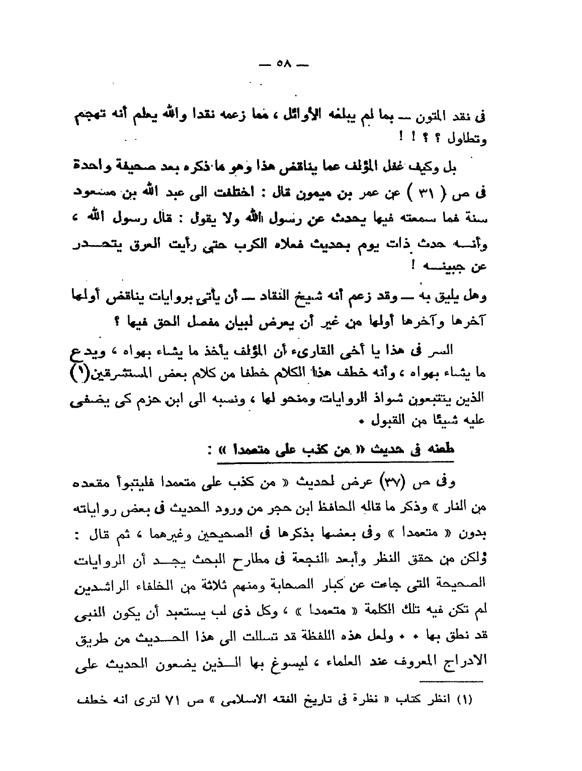 وفي [ص 37] عرض لحديث «مَنْ كَذَبَ عَلَيَّ مُتَعَمِّدًا فَلْيَتَبَوَّأْ مَقْعَدَهُ مِنَ النَّارِ» وذكر ما قاله الحافظ ابن حجر من وُرُودِ الحديث في بعض رواياته بدون «مُتَعَمِّدًا»، وفي بعضها بذكرها في " الصحيحين " وغيرهما ثم قال: «ولكن من حَقَّقَ النظر وأبعد النجعة في مطارح البحث يجد أنَّ الروايات الصحيحة التي جاءت عن كبار الصحابة ومنهم ثلاثة من الخلفاء الراشدين فيه تلك والكلمة «مُتَعَمِّدًا» وكل ذي لُبٍّ يستبعد أنْ يكون النَّبِي قد نطق بها ... ولعل هذه اللفظة قد تسللت إلى هذا الحديث من طريق الإدراج المعروف عند العلماء، لِيُسَوِّغَ بها الذين يضعون الحديث على