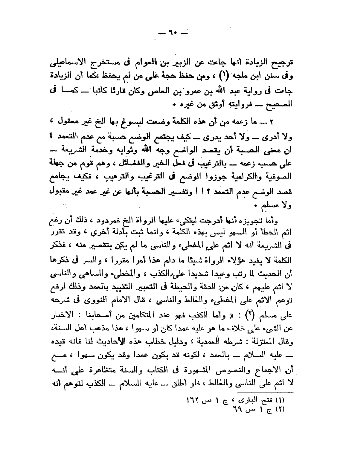 وأما تجويزة أنها أدرجت ليتكئ عليها الرُواة ... إلخ فمردود، ذلك أنَّ رفع إثم الخطأ أو السهو ليس بهذه الكلمة، وإنما ثبت بأدلة أخرى، وقد تقرَّر في الشريعة أنه لا إثم على المخطئ والناسي ما لم يكن بتقصير منه فذكر الكلمة لا يفيد هؤلاء الرُواة شيئاً ما دام هذا أمراً مُقَرَّراً، والسر في ذكرها أنَّ الحديث لما رَتَّبَ وعيداً شديداً على الكذب، والمخطئ والساهي والناسي لا إثم عليهم، كان من الدقة والحيطة في التعبير التقييد بالعمد وذلك لرفع تَوَهُّمٍ الإثم على المخطئ والغالط والناسي، قال الإمام النووي في " شرحه على مسلم " (¬2): «وَأَمَّا الكَذِبُ فَهُوَ عِنْدَ الْمُتَكَلِّمِينَ مِنْ أَصْحَابِنَا الإِخْبَارُ عَنِ الشَّيْءِ عَلَى خِلاَفِ مَا هُوَ عَمْدًا كَانَ أَوْ سَهْوًا هَذَا مَذْهَبُ أَهْلِ السُّنَّةِ، وَقَالَتِ الْمُعْتَزِلَةُ: شَرْطُهُ الْعَمْدِيَّةُ وَدَلِيلُ خِطَابِ هَذِهِ الأَحَادِيثِ لَنَا فَإِنَّهُ قَيَّدَهُ - عَلَيْهِ السَّلامُ - بِالْعَمْدِ لِكَوْنِهِ قَدْ يَكُونُ عَمْدًا وَقَدْ يَكُونُ سَهْوًا مَعَ أَنَّ الإِجْمَاعَ وَالنُّصُوصَ الْمَشْهُورَةَ فِي الْكِتَابِ وَالسُّنَّةِ مُتَوَافِقَةٌ مُتَظَاهِرَةٌ عَلَى أَنَّهُ لاَ إِثْمَ عَلَى الناسي والغالط، فَلَوْ أَطْلَقَ - عَلَيْهِ السَّلاَمُ - الكَذِبَ لَتُوُهِّمَ أَنَّهُ