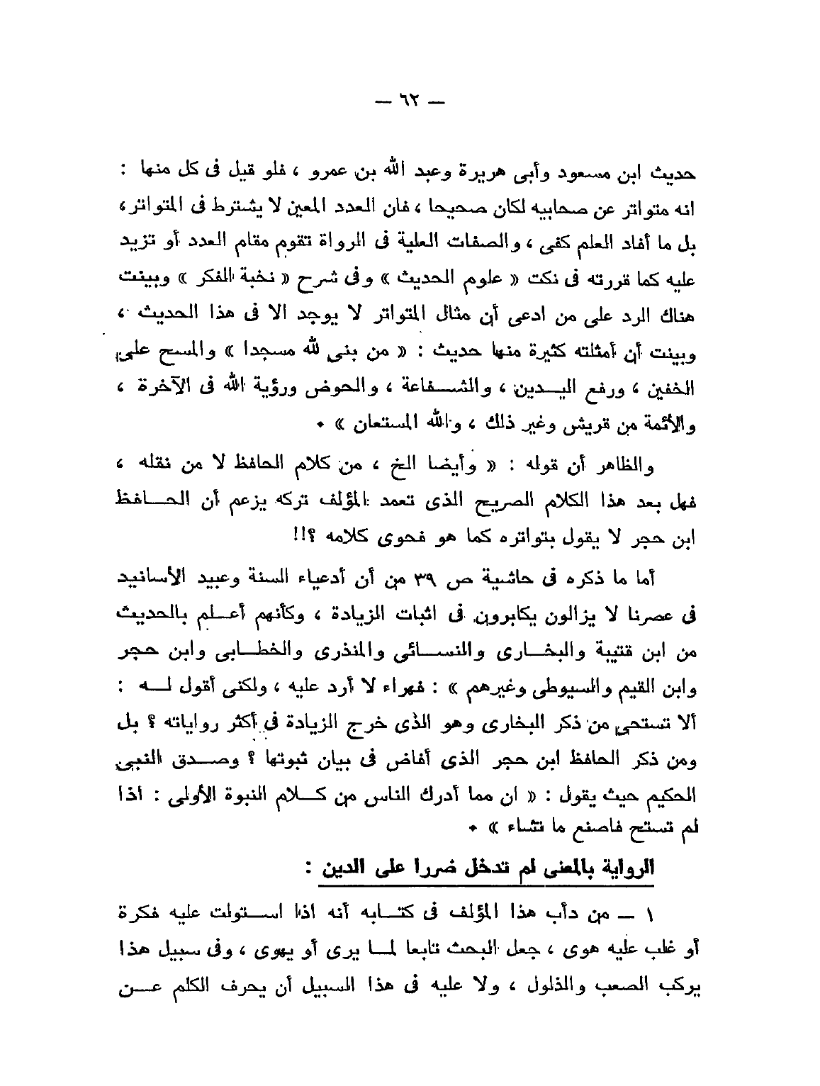 حديث ابن مسعود وأبي هريرة وعبد الله بن عمرو، فلو قيل في كل منها: إنه متواتر عن صحابيه لكان صحيحاً، فإنَّ العدد المُعَيَّنَ لا يشترط في المتواتر، بل ما أفاد العلم كفى، والصفات العلية في الرُواة تقوم مقام العدد أو تزيد عليه كما قررته في نكت " علوم الحديث " وفي شرح " نخبة الفكر " وَبَيَّنْتُ هناك الرَدَّ على من ادَّعَى أنَّ مثال المتواتر لا يوجد إِلاَّ في هذا الحديث، وَبَيَّنْتُ أنَّ أمثلته كثيرة منها حديث: «مَنْ بَنَى لِلَّهِ مَسْجِدًا»، والمسح على الخفين، ورفع اليدين، والشفاعة، والحوض، ورؤية الله في الآخرة، و «الأَئِمَّةُ مِنْ قُرَيْشٍ» وغير ذلك، والله المستعان».
