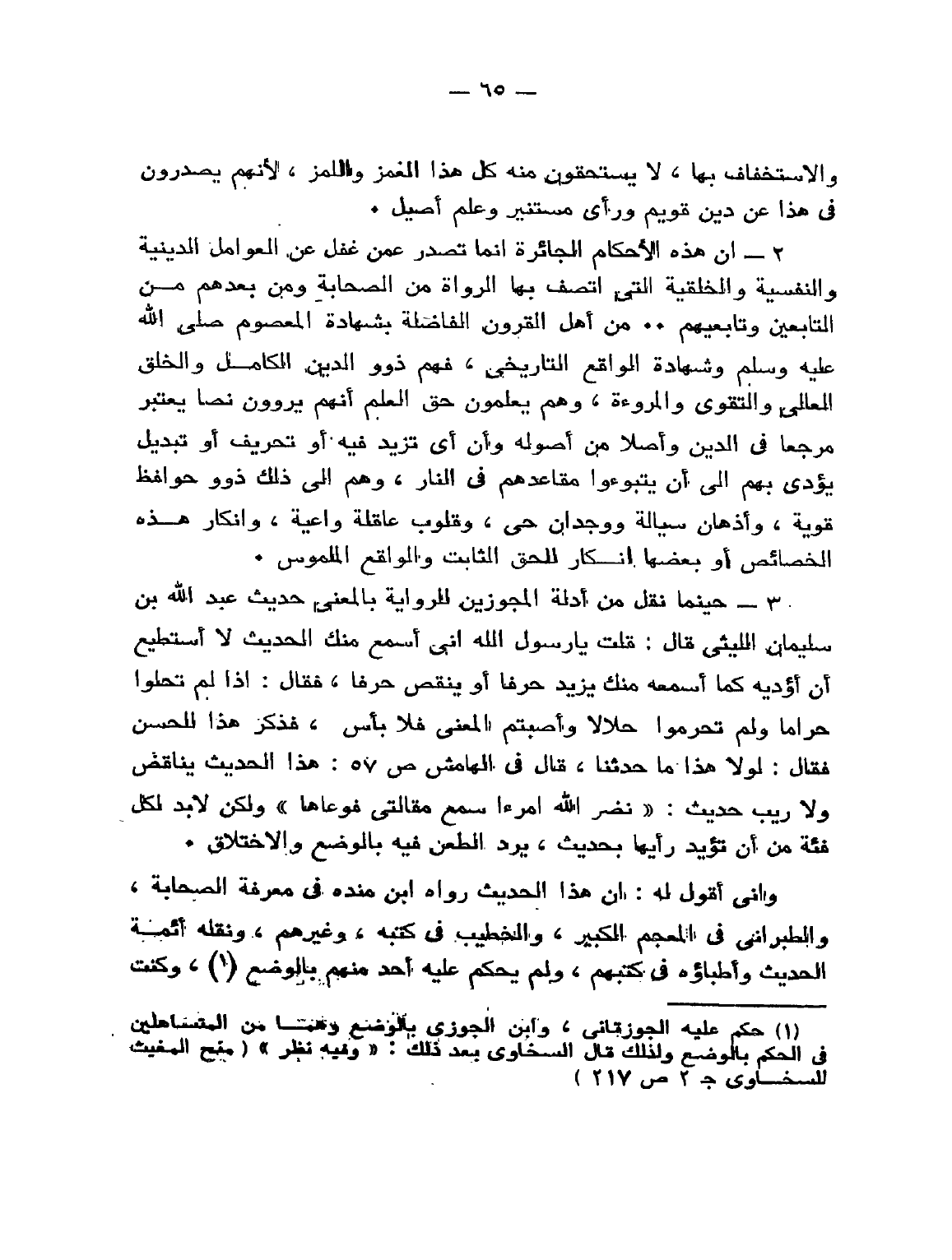 «قُلْتُ: يَا رَسُولَ اللَّهِ إِنِّي أَسْمَعُ مِنْكَ الْحَدِيثَ لاَ أَسْتَطِيعُ أَنْ أُؤَدِّيَهُ كَمَا أَسْمَعُ مِنْكَ يَزِيدُ حَرْفًا أَوْ يَنْقُصُ حَرْفًا، فَقَالَ: «إِذَا لَمْ تُحِلُّوا حَرَامًا، وَلَمْ تُحَرِّمُوا حَلاَلاً، وَأَصَبْتُمُ الْمَعْنَى فَلاَ بَأْسَ» فَذُكِرَ هَذَا لِلْحَسَنِ فَقَالَ: «لَوْلاَ هَذَا مَا حَدَّثَنَا»، قال في الهامش [ص 57]: هذا الحديث يناقض ولا ريب حديث: «نَضَّرَ اللَّهُ امْرَءًا سَمِعَ مَقَالَتِي فَوَعَاهَا» ولكن لا بُدَّ لكل فئة من أنْ تُؤَيِّدَ رأيها بحديث، يريد الطعن فيه بالوضع والاختلاق.