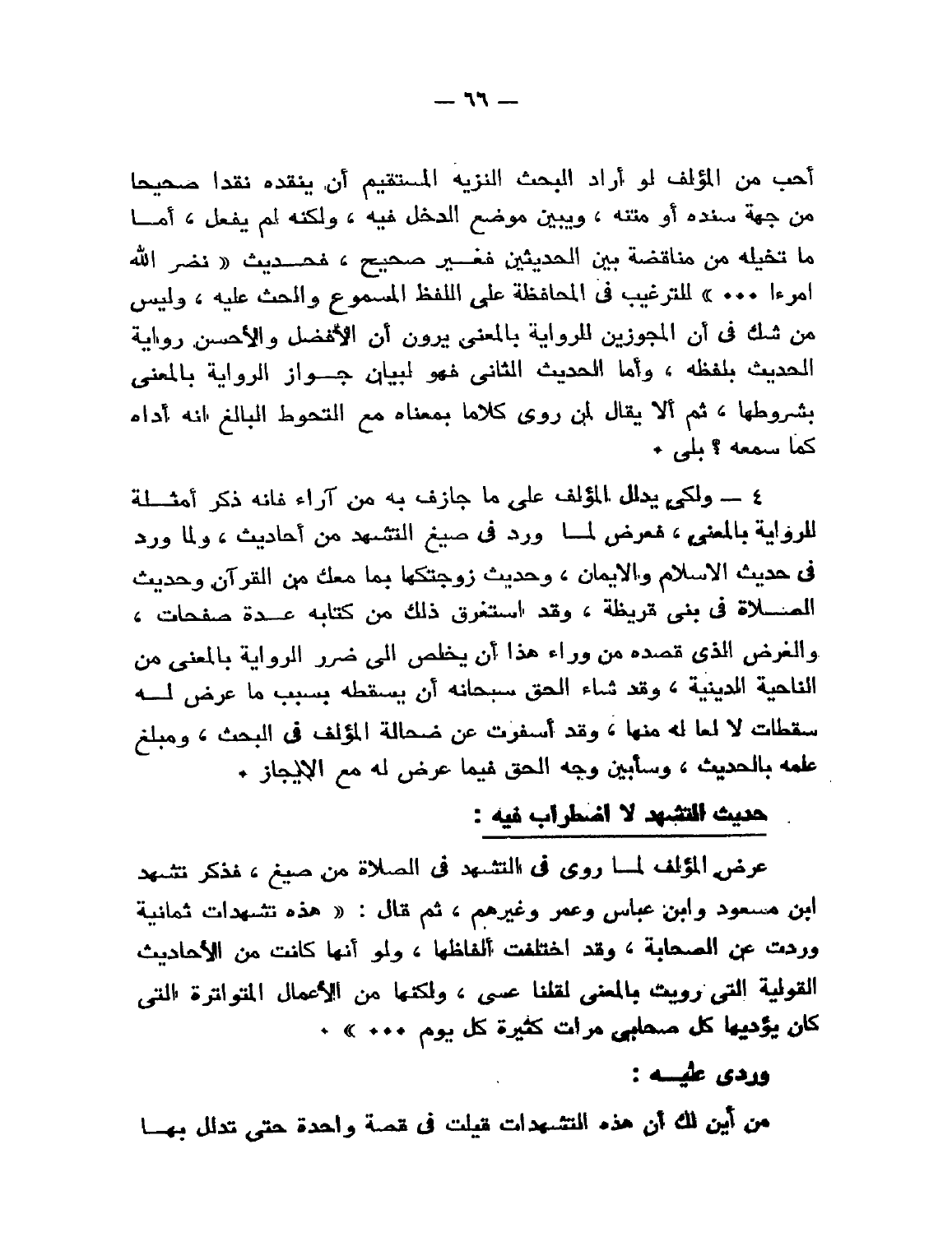 4 - ولكي يُدَلِّلَ المؤلف على ما جازف به من آراء فإنه ذكر أمثلة للرواية بالمعنى، فعرض لما ورد في صيغ التشهد من أحاديث، ولما ورد في «حديث الإسلام والإيمان»، و «حديث زوجتكما بما معك من القرآن» و «حديث من الصلاة في بني قريظة»، وقد استغرق ذلك من كتابه عِدَّةَ صفحات، والغرض الذي قصده من وراء هذا أنْ يخلص إلى ضرر الرواية بالمعني من الناحية الدينية، وقد شاء الحق سبحانه أنْ يسقطه بسبب ما عرض له سقطات لا لما له منها، وقد أسفرت عن ضحالة المؤلف في البحث، ومبلغ علمه بالحديث، وَسَأُبَيِّنُ وجه الحق فيما عرض له مع الإيجاز.