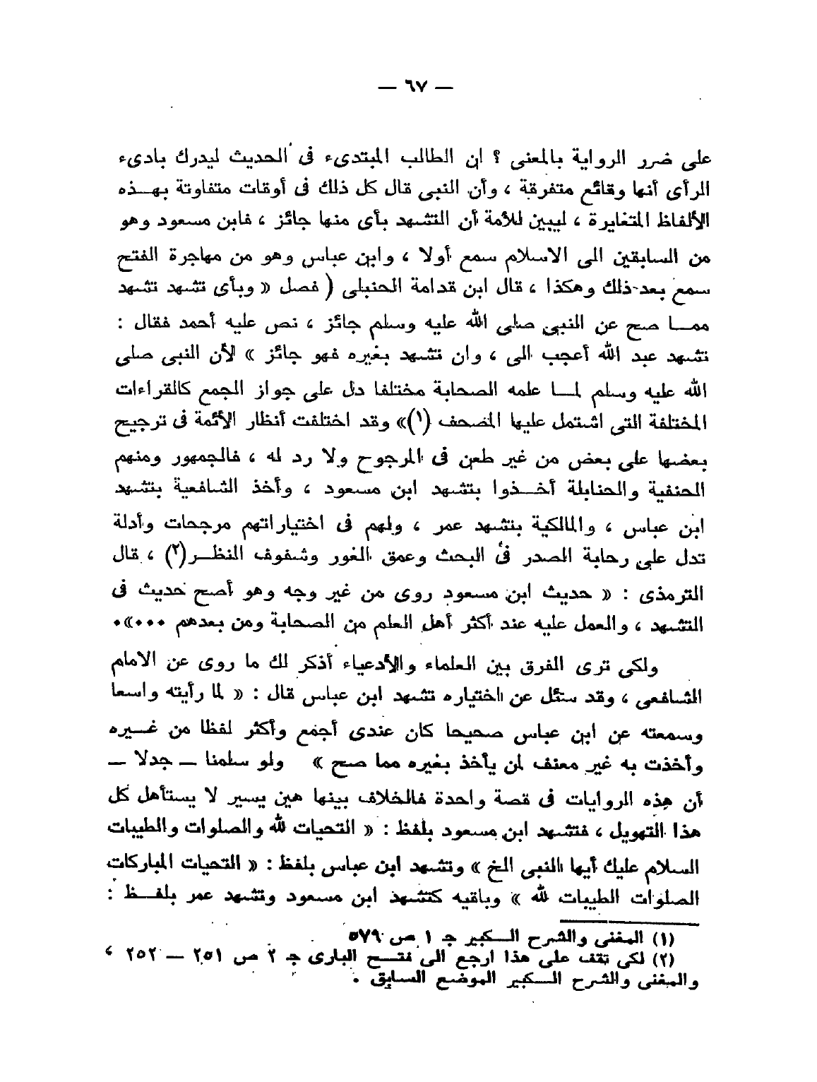 على ضرر الرواية بالمعنى؟ إِنَّ الطالب المبتدئ في الحديث ليدرك بادئ الرأي أنها وقائع متفرقة، وأنَّ النَّبِي قال كل ذلك في أوقات متفاوته بهذه الألفاظ المتغايرة، لِيُبَيِّنَ للأمَّة أنَّ التشهد بأي منها جائز، فابن مسعود وهو من السابقين إلى الإسلام سمع أولاً وابن عباس وهو من مهاجرة الفتح سمع بعد ذلك وهكذا، قال ابن قدامة الحنبلي: (فَصْلٌ: «وَبِأَيِّ تَشَهُّدٍ تَشَهَّدَ مِمَّا صَحَّ عَنْ النَّبِيِّ - صَلََّى اللهُ عَلَيْهِ وَسَلَّمَ - جَائِزٌ. نَصَّ عَلَيْهِ أَحْمَدُ فَقَالَ: " تَشَهُّدُ عَبْدِ اللَّهِ أَعْجَبُ إلَيَّ، وَإِنْ تَشَهَّدَ بِغَيْرِهِ فَهُوَ جَائِزٌ "؛ لأَنَّ النَّبِيَّ - صَلََّى اللهُ عَلَيْهِ وَسَلَّمَ - لَمَّا عَلَّمَهُ الصَّحَابَةَ مُخْتَلِفًا دَلَّ عَلَى جَوَازِ الْجَمِيعِ، كَالْقِرَاءَاتِ الْمُخْتَلِفَةِ الَّتِي اشْتَمَلَ عَلَيْهَا الْمُصْحَفُ» (¬1) وقد اختلفت أنظار الأئمة في ترجيح بعضها على بعض من غير طعن في المرجوح ولا رَدَّ له، فالجمهور ومنهم الحنفية والحنابلة أخذوا بتشهد ابن مسعود، وأخذ الشافعية بتشهد ابن عباس، والمالكية بتشهد عمر، ولهم في اختياراتهم مُرَجِّحَاتٌ وأدلة تدل على رحابة الصدر في البحث وعمق الغور وشفوف النظر (¬2)، قال الترمذي: «حديث ابن مسعود رُوِيَ من غير وجه وهو أصح حديث في التشهد، والعمل عليه عند أكثر أهل العلم من الصحابة ومن بعدهم ... ».