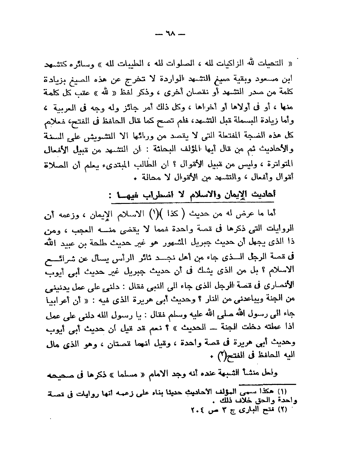 أما ما عرض له من «حديث (كذا) (¬1) الإسلام الإيمان»، وزعمه أنَّ الروايات التي ذكرها في قصة واحدة فمِمَّا لا يقضي منه العجب، ومن ذا الذي يجهل أنَّ حديث جبريل المشهور هو غير حديث طلحة بن عُبيد الله في قصة الرجل الذي جاء من أهل نجد ثائر الرأس يسأل عن شرائع الإسلام؟ بل من الذي يشك في أنَّ حديث جبريل غير حديث أبي أيوب الأنصاري في قصة الرجل الذي جاء إلى النَّبِي، فقال: «دُلَّنِي عَلَى عَمِلٍ يُدْنِينِي مِنَ الْجَنَّةِ وَيُبَاعِدُنِي مِنَ النَّارِ؟»