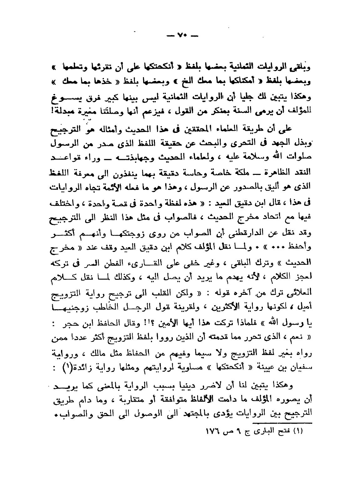وباقي الروايات الثمانية بعضها بلفظ: «أَنْكَحْتُكَهَا عَلَى أَنْ تُقْرِئَهَا وَتُعَلِّمَهَا» وبعضها بلفظ: «أَمْكَنَّاكَهَا بِمَا مَعَكَ» إلخ ... وبعضها بلفظ: «خُذْهَا بِمَا مَعَكَ» وهكذا يَتَبَيَّنُ لك جَلِيًّا أنَّ الروايات الثمانية ليس بينهما كبير فرق يسوغ للمؤلف أنْ يرمي السُنَّةَ بمنكر من القول، فيزعم أنها وصلتنا مغيرة مبدلة! على أنَّ طريقة العلماء المُحَقِّقِينَ في هذا الحديث وأمثاله هو الترجيح وبذل الجهد في التَحَرِّي والبحث عن حقيقة اللفظ الذي صدر من الرسول - صَلَوَاتُ اللهِ وَسَلاَمُهُ عَلَيْهِ -، ولعلماء الحديث وجهابذته - وراء قواعد النقد الظاهرة - مَلَكَةٌ خاصة وَحَاسَّةٌ دقيقة بهما ينفذون إلى معرفة اللفظ الذي هو أليق بالصدور عن الرسول، وهذا هو ما فعله الأئمة تُجَاهَ الروايات في هذا، قَالَ ابْنُ دَقِيقِ الْعِيدِ: «هَذِهِ لَفْظَةٌ وَاحِدَةٌ فِي قِصَّةٍ وَاحِدَةٍ، وَاخْتُلِفَ فِيهَا مَعَ اتِّحَادِ مَخْرَجِ الْحَدِيثِ، ... فَالصَّوَابُ فِي مِثْلِ هَذَا النَّظَرُ إِلَى التَّرْجِيحِ وَقَدْ نُقِلَ عَنِ الدَّارَقُطْنِيِّ أَنَّ الصَّوَابَ [رِوَايَةُ] مَنْ رَوَى " زَوَّجْتُكَهَا " وَأَنَّهُمْ أَكْثَرُ وَأَحْفَظُ ... ». ولما نقل المؤلف كلام ابن دقيق العيد وقف عند «مخرج الحديث» وترك الباقي، وغير خَفِيٍّ على القارئ الفطن السِرَّ في تركه لعجز الكلام، لأنه يهدم ما يريد أنْ يصل إليه، وكذلك لما نقل كلام العلائي ترك من آخره قوله: «ولكن القلب إلى ترجيح رواية الترويج أميل لكونها رواية الأكثرين، ولقرينة قول الرجل الخاطب زوجنيها يا رسول الله» فلماذا تركت هذا أيها الأمين؟! وقال الحافظ ابن حجر: «نعم، الذي تحرر مِمَّا قدمته أن الذين رووا بلفظ التزويج أكثر عددا مِمَّنْ رواه بغير لفظ التزويج ولا سيما وفيهم من الحفاظ مثل مالك، ورواية سفيان بن عيينة «أنكحتكها» مساوية لروايتهم ومثلها رواية زائدة (¬1).