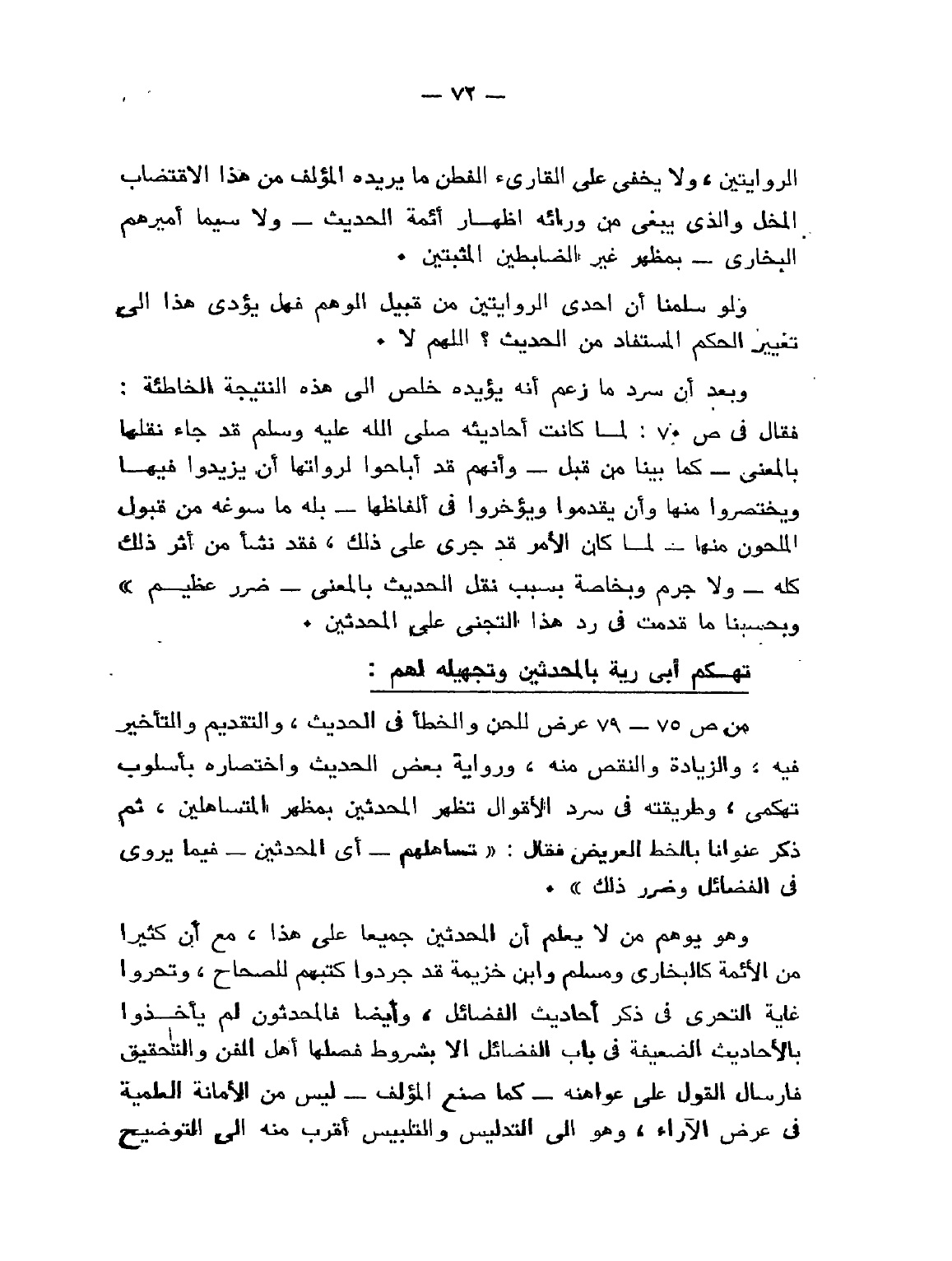 من [ص 75 - 79] عرض للحن والخطأ في الحديث، والتقديم والتأخير فيه والزيادة والنقص منه، ورواية بعض الحديث واختصار بأسلوب تهكُّمي، وطريقته في سرد الأقوال تظهر المُحَدِّثِينَ بمظهر المتساهلين، ثم ذكر عنواناً بالخط العريض فقال: «تساهلهم - أي المُحَدِّثِينَ - فيما يروى في الفضائل وضرر ذلك».