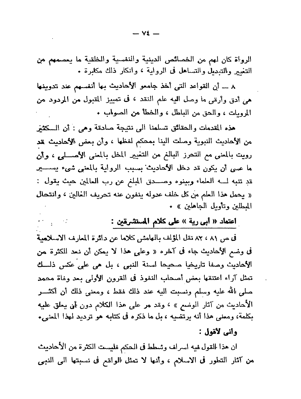 في [ص 81، 82] نقل المؤلف بالهامش كلاماً عن " دائرة المعارف الإسلامية " في وضع الأحاديث جاء في آخره «وعلى هذا لا يمكن أنْ نَعُدَّ للكثرة من الأحاديث وصفاً تاريخياً لِسُنَّةِ النَّبِي، بل هي على عكس ذلك تمثل آراء اعتنقها بعض أصحاب النفوذ في القرون الأولى بعد وفاة محمد - صَلََّى اللهُ عَلَيْهِ وَسَلَّمَ - ونسبت إليه عند ذلك فقط، ومعنى ذلك أنَّ أكثر الأحاديث من آثار الوضع» وقد مر على هذا الكلام دون أنْ يُعَلِّقَ عليه بكلمة، ومعنى هذا أنه يرتضيه، بل ما ذكره في كتابه هو ترديد لهذا المعنى.