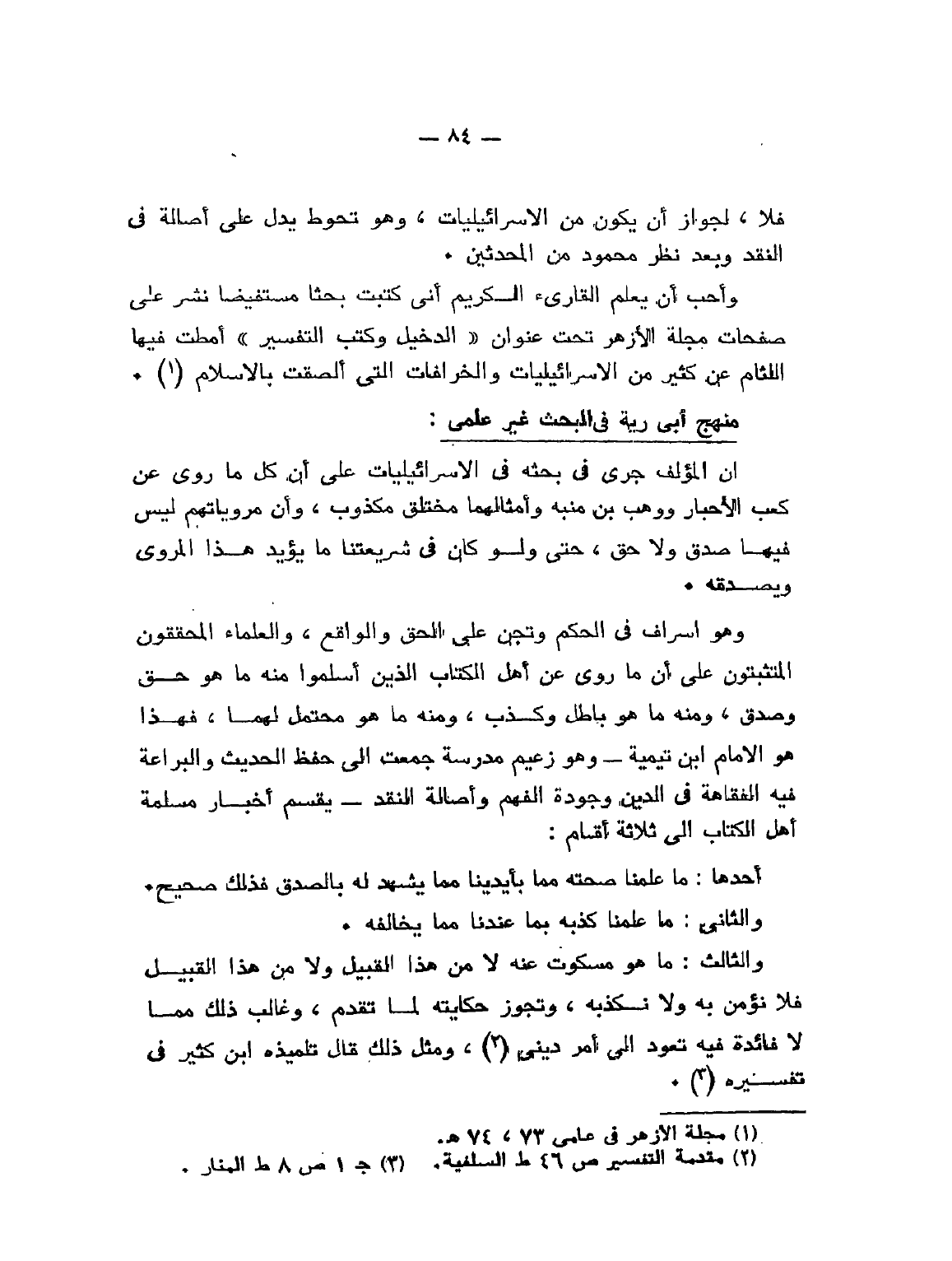 وَأُحِبُّ أنْ يعلم القارئ الكريم أني كتبت بحثاً مستفيضاً نشر على صفحات " مجلة الأزهر " تحت عنوان «الدخيل وكتب التفسير» أمطت فيها اللثام عن كثير من الإسرائيليات والخرافات التي ألصقت بالإسلام (¬1).