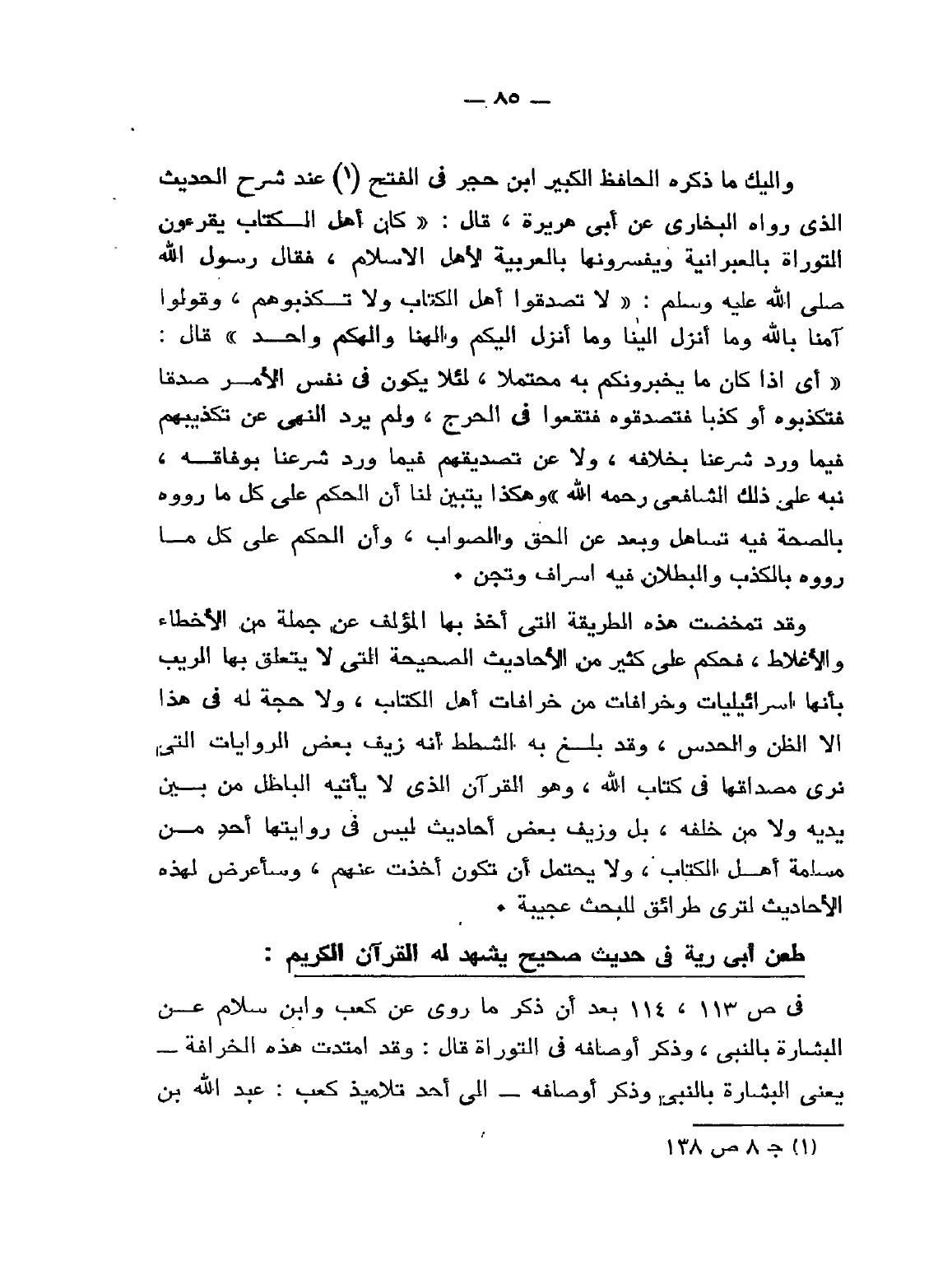 في [ص 113، 114] بعد أَنْ ذكر ما روي عن كعب وابن سَلاَّم عن البشارة بِالنَّبِيِّ، وذكر أوصافه في " التوراة " قال: «وقد امتدت هذه الخرافة - يعني البشارة بِالنَّبِيِّ وذكر أوصافه - إلى أحد تلاميذ كعب: عبد الله بن