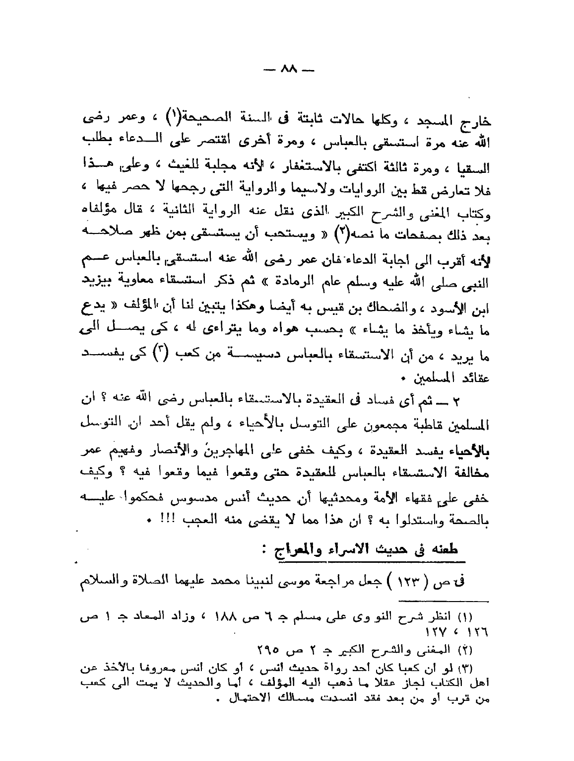 2 - ثم أي فساد في العقيدة بالاستسقاء بالعباس - رَضِيَ اللهُ عَنْهُ -؟ إنَّ المسلمين قاطبة مجمعون على التَوَسُّلِ بالأحياء، ولم يقل أحد إنَّ التوسل بالأحياء يفسد العقيدة، وكيف خَفِيَ على المهاجرين والأنصار وفيهم عمر مخالفة الاستسقاء بالعباس للعقيدة حتى وقعوا فيما وقعوا فيه؟ وكيف خَفِيَ على فقهاء الأمَّة وَمُحَدِّثِيهَا أَنَّ حديث أنس مدسوس فحكموا عليه بالصحة واستدلوا به؟ إنَّ هذا مِمَّا لا يقضي منه العجب!!!.