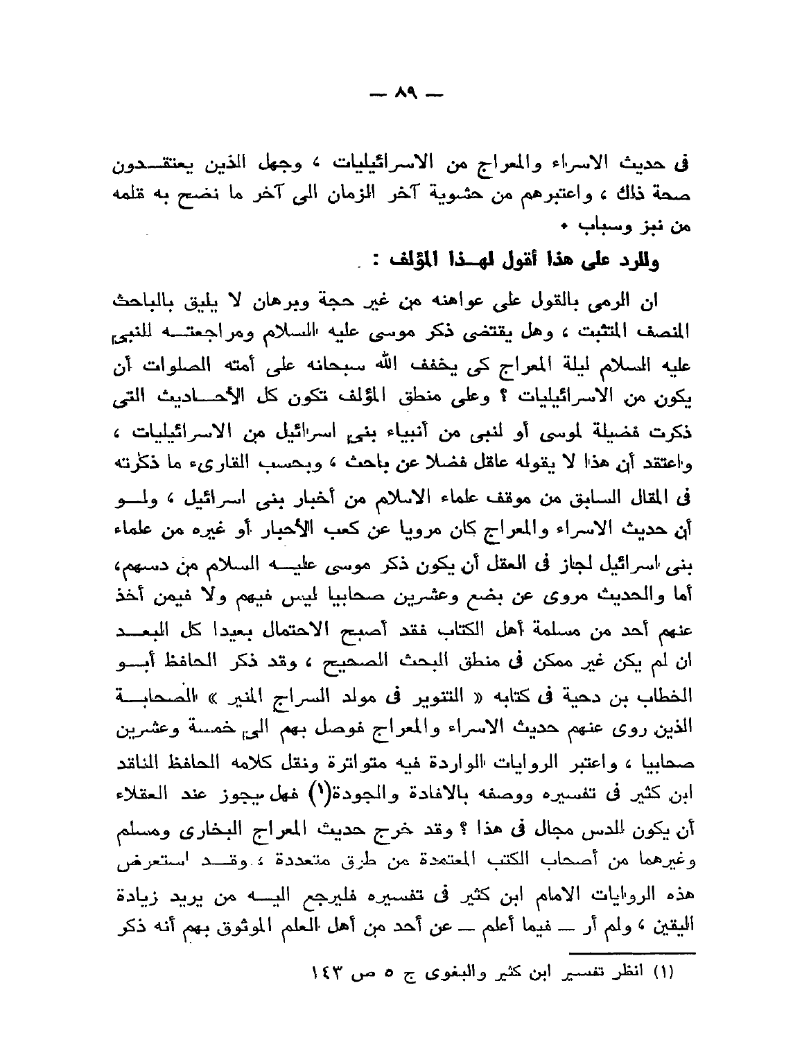 في حديث الإسراء والمعراج من الإسرائيليات، وجهل الذين يعتقدون صحة ذلك، واعتبرهم من حشوية آخر الزمان إلى آخر ما نضح به قلمه من نبز وسباب.
