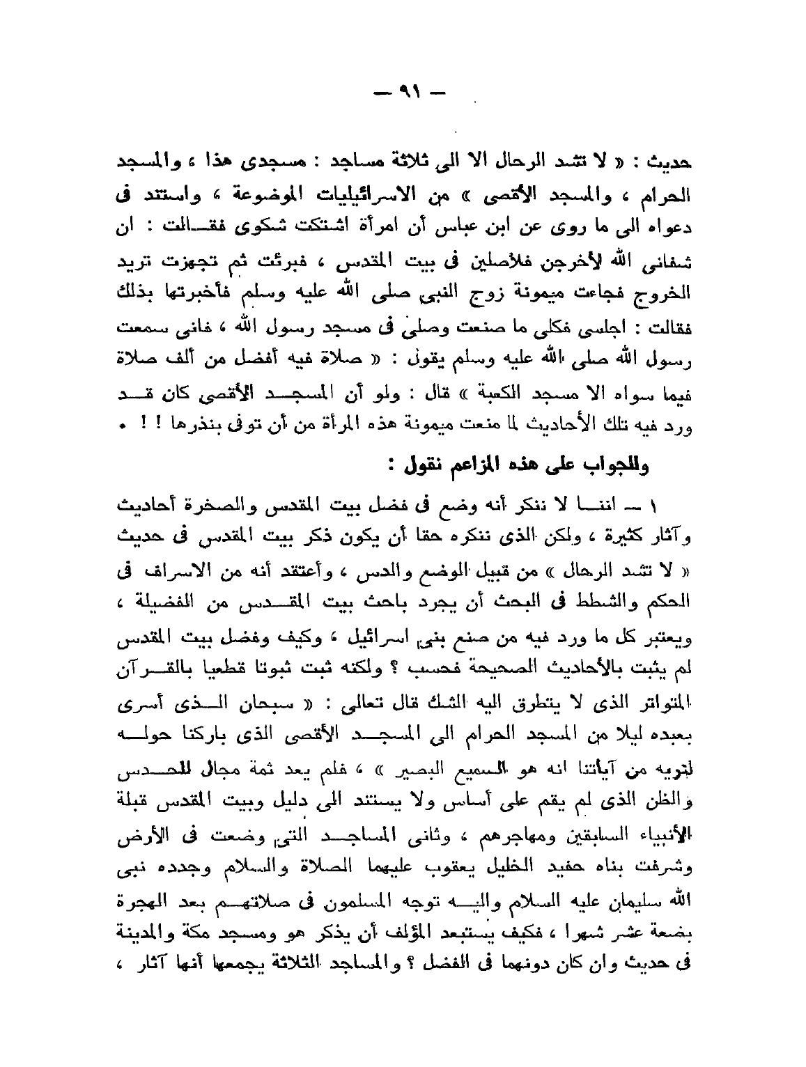 1 - إننا لا ننكر أنه وُضِعَ في فضل بيت المقدس والصخرة أحاديث وآثار كثيرة، ولكن الذي ننكره حقًا أَنْ يكون ذكر بيت المقدس في حديث «لاَ تُشَدُّ الرِّحَالُ» من قبيل الوضع والدَسِّ، وأعتقد أنه من الإسراف في الحُكْم والشطط في البحث أَنْ يُجَرِّدَ باحث بيت المقدس من الفضيلة، ويعتبر كل ما ورد فيه من صنع بني إسرائيل، وكيف وفضل بيت المقدس لم يثبت بالأحاديث الصحيحة فحسب؟ ولكنه ثبت ثبوتاً قطعياً بالقرآن المتواتر الذي لا يتطرق إليه الشك قال تعالى: {سُبْحَانَ الَّذِي أَسْرَى بِعَبْدِهِ لَيْلاً مِنَ الْمَسْجِدِ الْحَرَامِ إِلَى الْمَسْجِدِ الأَقْصَى الَّذِي بَارَكْنَا حَوْلَهُ لِنُرِيَهُ مِنْ آيَاتِنَا إِنَّهُ هُوَ السَّمِيعُ الْبَصِيرُ} (¬1) فلم يَعُدْ ثَمَّةَ مجال للحدس والظن الذي لم يقم على أساس ولا يستند إلى دليل وبيت المقدس قِبْلَةُ الأنبياء السابقين ومهاجرهم، وثاني المساجد التي وضعت في الأرض وشرفت بناه حفيد الخليل يعقوب - عَلَيْهِمَا الصَلاَةُ وَالسَّلاَمُ - وَجَدَّدَهُ نبي الله سليمان - عَلَيْهِ السَّلاَمُ - وإليه توجه المسلمون في صلاتهم بعد الهجرة بضعة عشر شهراً، فكيف يستبعد المؤلف أَنْ يذكر هو ومسجد مكة والمدينة في حديث وَإِنْ كان دونهما في الفضل؟ والمساجد الثلاثة يجمعها أنها آثار،