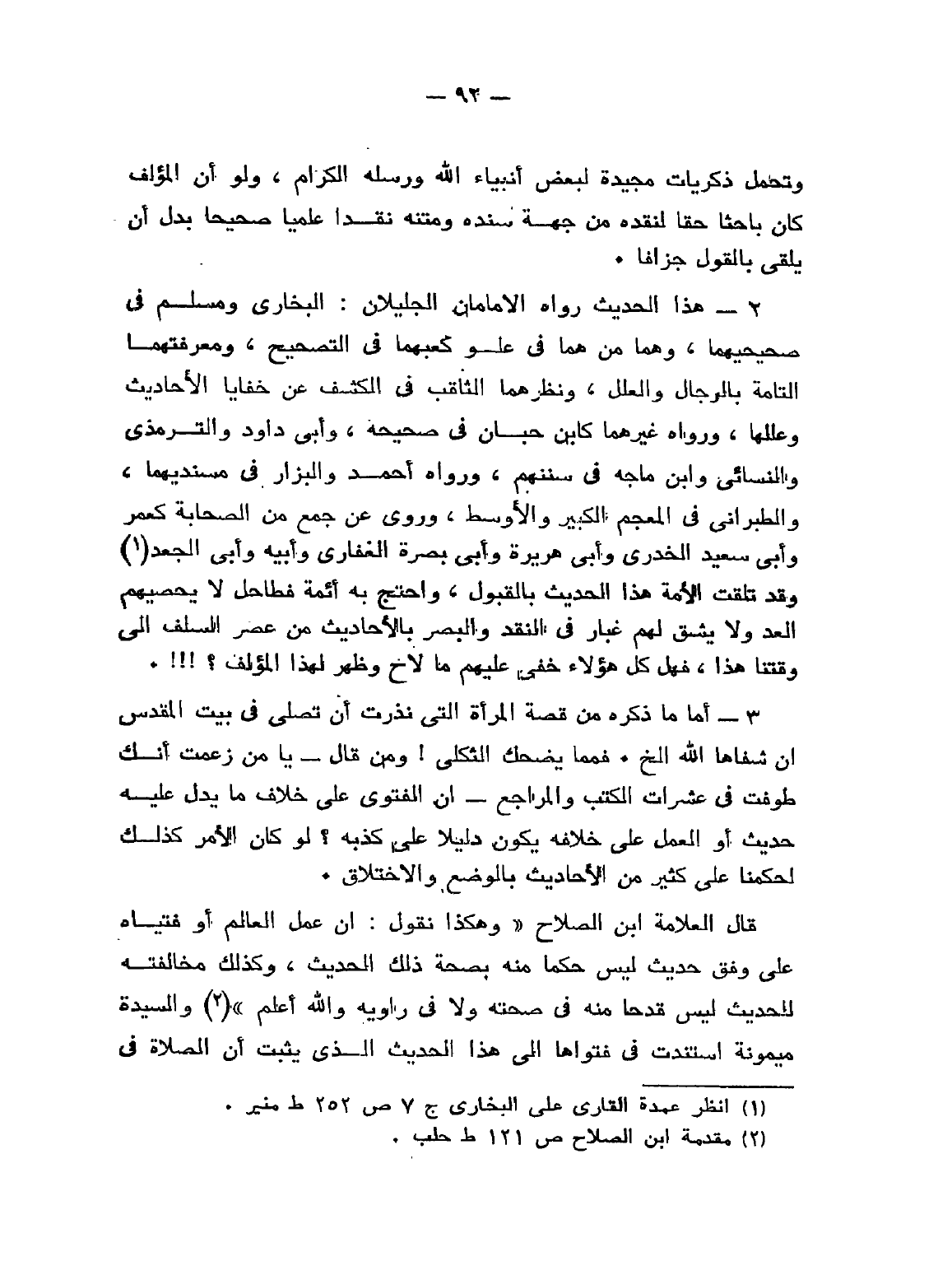 3 - أما ما ذكره من قصة المرأة التي نذرت أَنْ تصلي في بيت المقدس إنْ شفاها الله ... إلخ. فَمِمَّا يضحك الثكلى! ومن قال - يا من زعمت أنك طوفت في عشرات الكتب والمراجع - أَنَّ الفتوى على خلاف ما يدل عليه حديث أو العمل على خلافه يكون دليلاً على كذبه؟ لو كان الأمر كذلك لحكمنا على كثير من الأحاديث بالوضع والاختلاق.