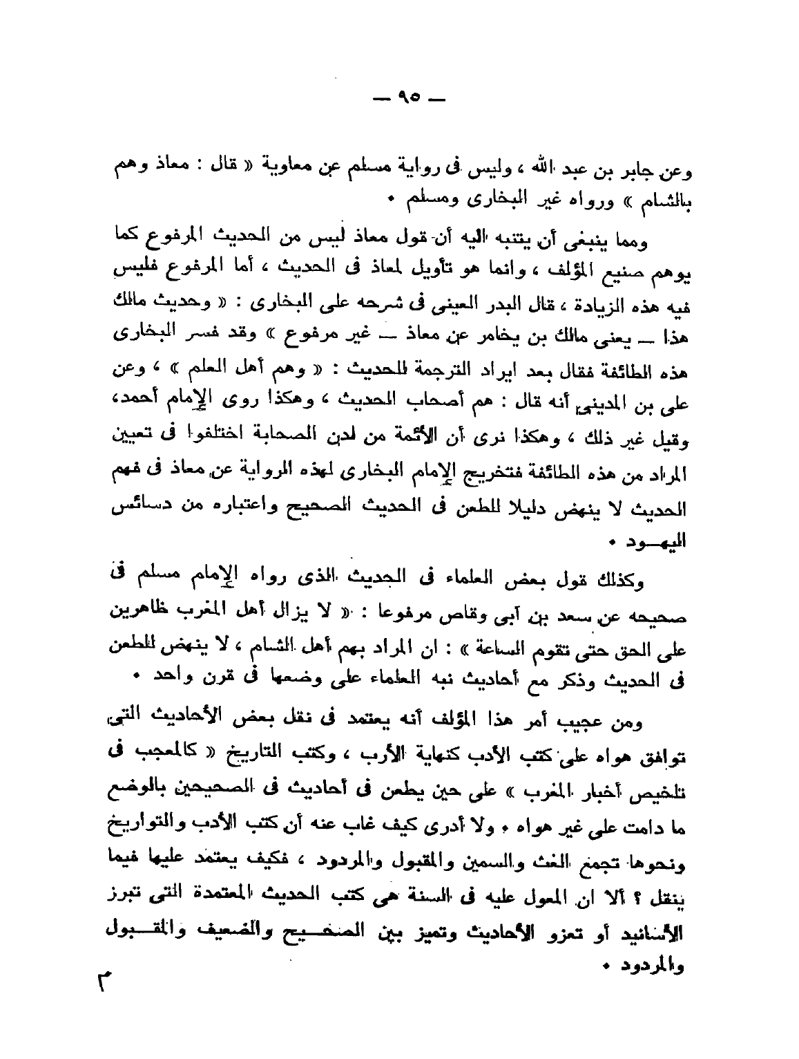 ومِمَّا ينبغي أن يتنبه إليه أن قول معاذ ليس من الحديث المرفوع كما يوهم صنيع المؤلف، وإنما هو تأويل لمعاذ في الحديث، أما المرفوع فليس فيه هذه الزيادة، قال البدر العيني في " شرحه على البخاري ": وحديث مالك هذا - يعني - هذا - يعني مازل بن يخامر عن معاذ - غير مرفوع» وقد فسر البخاري هذه الطائفة فقال بعد إيراد الترجمة للحديث: «وَهُمْ أَهْلُ الْعِلْمِ» وعن علي بن المديني أنه قال: هم أصحاب الحديث، وهكذا روي عن الإمام أحمد وقيل غير ذلك نرى أن الأئمة من لدن الصحابة اختلفوا في تعيين المراد من هذه الطائفة فتخريج الإمام البخاري لهذه الرواية عن معاذ في فهم الحديث لا ينهض دليلا للطعن في الحديث الصحيح واعتباره من دسائس اليهود.