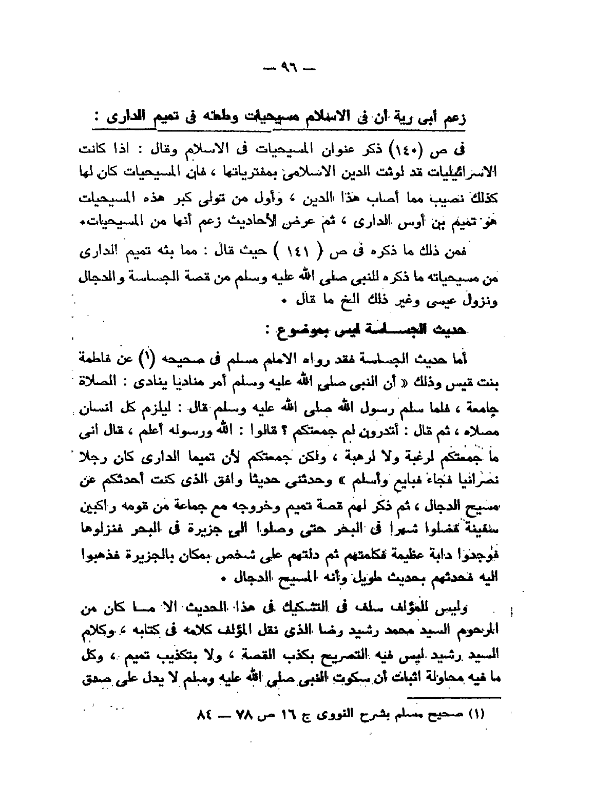 في ص [140] ذكر عنوان المسيحيات في الإسلام وقال: إذا كانت الإسرائيليات قد لوثت الدين الإسلامي بمفترياتها، فإنَّ المسيحيات كان لها كذلك نصيب مِمَّا أصاب هذا الدين، وأول من تولى كِبْرَ هذه المسيحيات هو تميم بن أوس الداري، ثم عرض لأحاديث زعم أنها من المسيحيات.