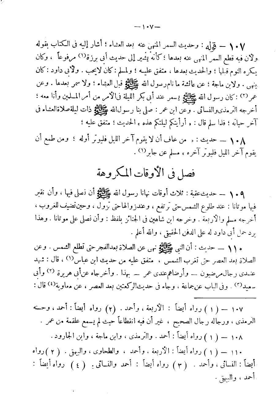 107 - قَوْله وَحَدِيث السمر الْمنْهِي عَنهُ بعد الْعشَاء أَشَارَ أليه فِي الْكتاب بقوله وَلِأَن فِيهِ قطع السمر المنهى عَنهُ بعْدهَا كَأَنَّهُ يُشِير إِلَى حَدِيث أبي بَرزَة مَرْفُوعا وَكَانَ يكره النّوم قبلهَا والْحَدِيث بعْدهَا مُتَّفق عَلَيْهِ وَلمُسلم كَانَ لَا يحب وَلأبي دَاوُد كَانَ يُنْهِي ولإبن ماجة عَن عَائِشَة مَا نَام رَسُول الله صَلَّى اللَّهُ عَلَيْهِ وَسَلَّم َ قبل الْعشَاء ولاسمر بعْدهَا وَعَن عمر كَانَ رَسُول الله صَلَّى اللَّهُ عَلَيْهِ وَسَلَّم َ يسمر عِنْد أبي بكر اللَّيْلَة فِي الْأَمر من أَمر الْمُسلمين وَأَنا مَعَه أخرجه التِّرْمِذِيّ وَالنَّسَائِيّ وَعَن ابْن عمر صَلَّى بِنَا رَسُول الله صَلَّى اللَّهُ عَلَيْهِ وَسَلَّم َ ذَات لَيْلَة صَلَاة الْعشَاء فِي آخر حَيَاته فَلَمَّا سلم قَالَ أَرَأَيْتكُم ليلتكم هَذِه الحَدِيث مُتَّفق عَلَيْهِ