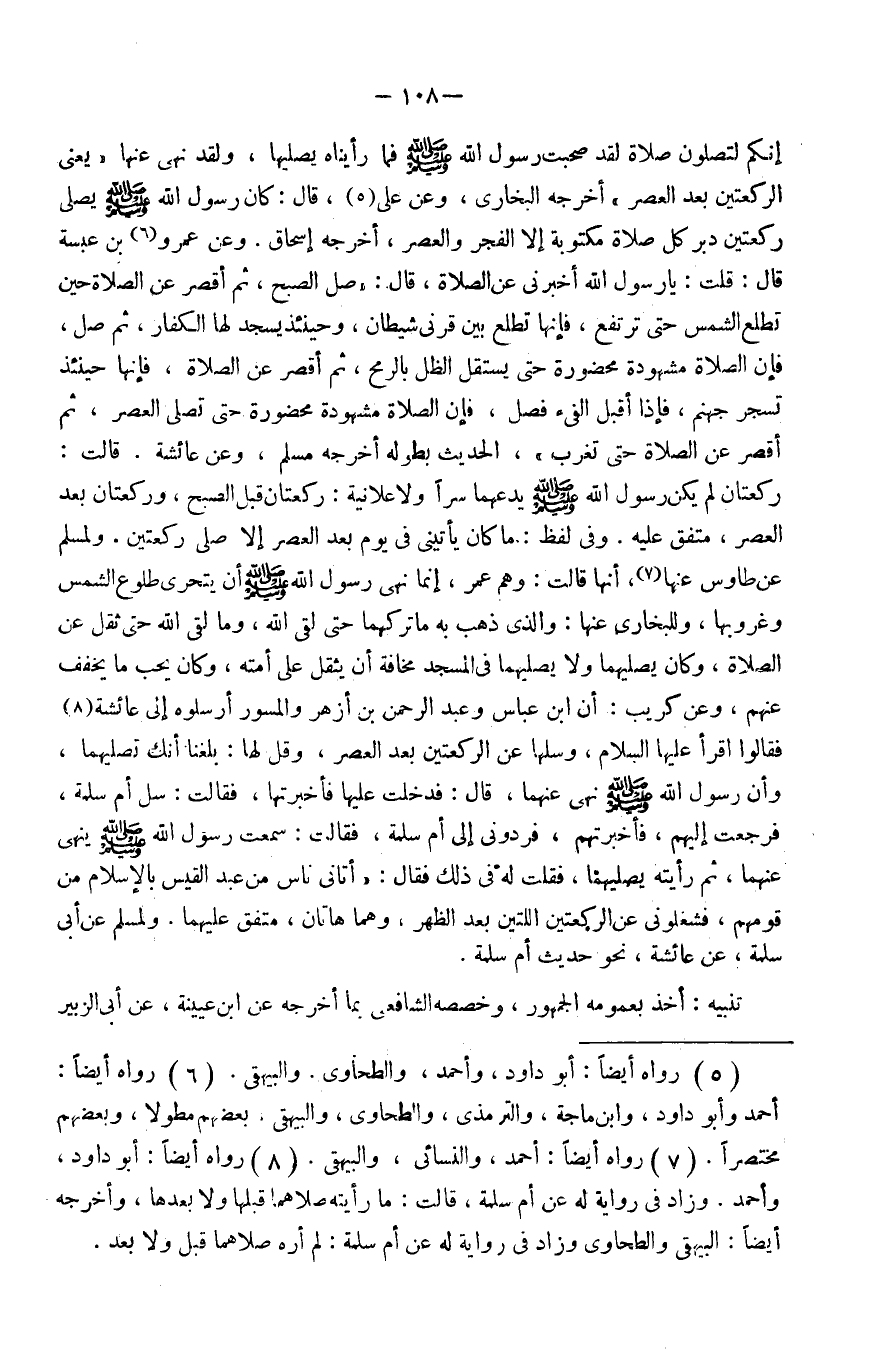 إِنَّكُم لتصلون صَلَاة لقد صَحِبت رَسُول الله صَلَّى اللَّهُ عَلَيْهِ وَسَلَّم َ فَمَا رَأَيْنَاهُ يُصليهَا وَلَقَد نهَى عَنْهَا يَعْنِي الرَّكْعَتَيْنِ بعد الْعَصْر أخرجه البُخَارِيّ وَعَن عَلّي قَالَ كَانَ رَسُول الله صَلَّى اللَّهُ عَلَيْهِ وَسَلَّم َ يُصَلِّي رَكْعَتَيْنِ دبر كل صَلَاة مَكْتُوبَة إِلَّا الْفجْر وَالْعصر أخرجه إِسْحَاق وَعَن عَمْرو بن عبسة قَالَ قلت يَا رَسُول الله أَخْبرنِي عَن الصَّلَاة قَالَ صل الصُّبْح ثمَّ أقصر عَن الصَّلَاة حِين تطلع الشَّمْس حَتَّى ترْتَفع فَإِنَّهَا تطلع بَين قَرْني شَيْطَان وَحِينَئِذٍ يسْجد لَهَا الْكفَّار ثمَّ صل فَإِن الصَّلَاة مَشْهُودَة محضورة حَتَّى يسْتَقلّ الظل بِالرُّمْحِ ثمَّ أقصر عَن الصَّلَاة فَإِنَّهَا حِينَئِذٍ تسجر جَهَنَّم فَإِذا أقبل الْفَيْء فصل فَإِن الصَّلَاة مَشْهُودَة محضورة حَتَّى تصلي الْعَصْر ثمَّ أقصر عَن الصَّلَاة حَتَّى تغرب الحَدِيث بِطُولِهِ أخرجه مُسلم وَعَن عَائِشَة قَالَت رَكْعَتَانِ لم يكن رَسُول الله صَلَّى اللَّهُ عَلَيْهِ وَسَلَّم َ يدعهما سرا وَلَا عَلَانيَة رَكْعَتَانِ قبل الصُّبْح وركعتان بعد الْعَصْر مُتَّفق عَلَيْهِ وَفِي لفظ مَا كَانَ يأتيني فِي يَوْم بعد الْعَصْر إِلَّا صَلَّى رَكْعَتَيْنِ وَلمُسلم عَن طَاوس عَنْهَا إِنَّهَا قَالَت وهم عمر إِنَّمَا نهَى رَسُول الله صَلَّى اللَّهُ عَلَيْهِ وَسَلَّم َ أَن يتَحَرَّى طُلُوع الشَّمْس وغروبها وللبخاري عَنْهَا وَالَّذِي ذهب بِهِ مَا تَركهمَا حَتَّى لَقِي الله وَمَا لَقِي الله حَتَّى ثقل عَن الصَّلَاة وَكَانَ يُصَلِّيهمَا فِي الْمَسْجِد مَخَافَة أَن يثقل عَلَى أمته وَكَانَ يحب مَا يُخَفف عَنْهُم وَعَن كريب أَن ابْن عَبَّاس وَعبد الرَّحْمَن بن أَزْهَر والمسور إرسلوه إِلَى عَائِشَة فَقَالُوا إقرأ عَلَيْهَا السَّلَام وسلها عَن الرَّكْعَتَيْنِ بعد الْعَصْر وَقل لَهَا بلغنَا أَنَّك تصليهما وَأَن رَسُول الله صَلَّى اللَّهُ عَلَيْهِ وَسَلَّم َ نهَى عَنْهُمَا قَالَ فَدخلت عَلَيْهَا فَأَخْبَرتهَا فَقَالَت سل أم سَلمَة فَرَجَعت إِلَيْهِم فَأَخْبَرتهمْ فردوني إِلَى أم سَلمَة فَقَالَت سَمِعت رَسُول الله صَلَّى اللَّهُ عَلَيْهِ وَسَلَّم َ ينْهَى عَنْهُمَا ثمَّ رَأَيْته يُصَلِّيهمَا فَقلت لَهُ فِي ذَلِك فَقَالَ أَتَانِي نَاس من عبد الْقَيْس بِالْإِسْلَامِ من قَومهمْ فشغلوني عَن الرَّكْعَتَيْنِ اللَّتَيْنِ بعد الظّهْر وهما هَاتَانِ مُتَّفق عَلَيْهِمَا وَلمُسلم عَن أبي سَلمَة عَن عَائِشَة نَحْو حَدِيث أم سَلمَة