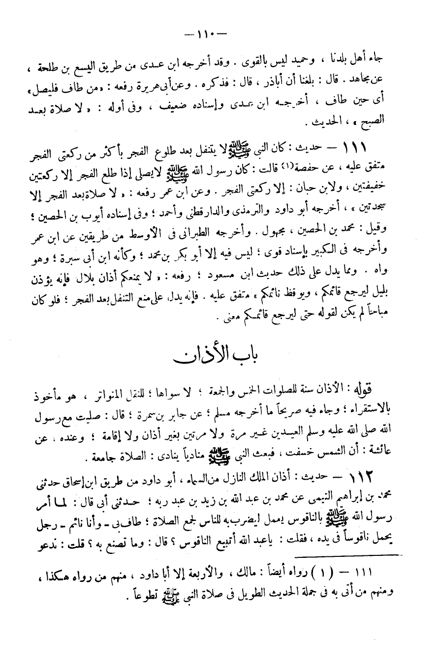111 - حَدِيث كَانَ النَّبِي صَلَّى اللَّهُ عَلَيْهِ وَسَلَّم َ لَا يتَنَفَّل بعد طُلُوع الْفجْر بِأَكْثَرَ من رَكْعَتي الْفجْر مُتَّفق عَلَيْهِ عَن حَفْصَة قَالَت كَانَ رَسُول الله صَلَّى اللَّهُ عَلَيْهِ وَسَلَّم َ إِذا طلع الْفجْر إِلَّا رَكْعَتَيْنِ خفيفتين وَلابْن حبَان إِلَّا رَكْعَتي الْفجْر وَعَن ابْن عمر رَفعه لَا صَلَاة بعد الْفجْر إِلَّا سَجْدَتَيْنِ أخرجه أَبُو دَاوُد وَالتِّرْمِذِيّ وَالدَّارَقُطْنِيّ وَأحمد وَفِي إِسْنَاده أَيُّوب بن الْحصين وَقيل مُحَمَّد بن الْحصين مَجْهُول وَأخرجه الطَّبَرَانِيّ فِي الْأَوْسَط من طَرِيقين عَن ابْن عمر وَأخرجه فِي الْكَبِير بِإِسْنَاد قوي لَيْسَ فِيهِ إِلَّا أَبُو بكر بن مُحَمَّد وَكَأَنَّهُ ابْن أبي سُبْرَة وَهُوَ واه وَمِمَّا يدل عَلَى ذَلِك حَدِيث ابْن مَسْعُود رَفعه لَا يمنعكم أَذَان بِلَال فَإِنَّهُ يُؤذن بلَيْل ليرْجع قائمكم ويوقظ نائمكم مُتَّفق عَلَيْهِ فَإِنَّهُ يدل عَلَى منع التَّنَفُّل بعد الْفجْر فَلَو كَانَ مُبَاحا لم يكن لقَوْله حَتَّى ليرْجع قائمكم مَعْنَى
