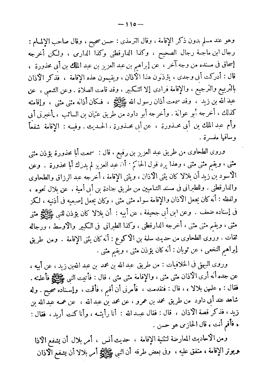 وَهُوَ عِنْد مُسلم بِدُونِ ذكر الْإِقَامَة وَقَالَ التِّرْمِذِيّ حسن صَحِيح وَقَالَ صَاحب الْإِلْمَام رجال ابْن ماجة رجال الصَّحِيح وَكَذَا الدَّارَقُطْنِيّ وَكَذَا الدَّارمِيّ وَلَكِن أخرجه إِسْحَاق فِي مُسْنده من وَجه آخر عَن إِبْرَاهِيم بن عبد الْعَزِيز بن عبد الْملك بن أبي مَحْذُورَة قَالَ أدْركْت أبي وجدي يُؤذن هَذَا الْأَذَان ويقيمون هَذِه الْإِقَامَة فَذكر الْأَذَان بالتربيع والترجيع وَالْإِقَامَة فرادي إِلَّا التَّكْبِير وَقد قَامَت الصَّلَاة وَعَن الشّعبِيّ عَن عبد الله بن زيد وَقد سَمِعت أَذَان رَسُول الله صَلَّى اللَّهُ عَلَيْهِ وَسَلَّم َ فَكَانَ أَذَانه مثنى مثنى وإقامته كَذَلِك أخرجه أَبُو عوانه وَأخرجه أَبُو دَاوُد من طَرِيق عُثْمَان بن السَّائِب أَخْبرنِي أبي وَأم عبد الْملك بن أبي مَحْذُورَة عَن أبي مَحْذُورَة الحَدِيث وَفِيه الْإِقَامَة شفعا وساقها مفسرة