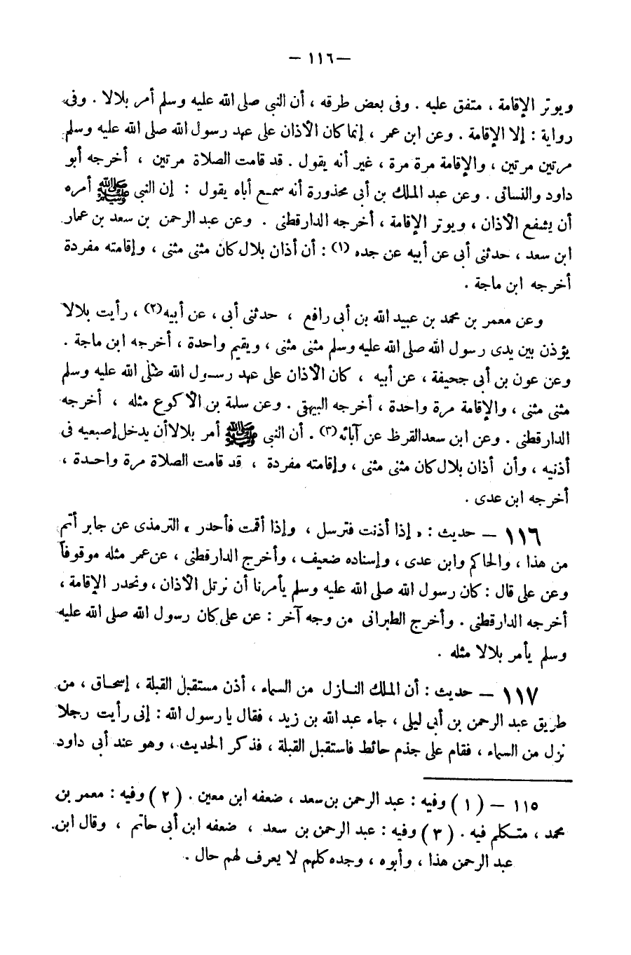 116 - حَدِيث إِذا أَذِنت فترسل وَإِذا أَقمت فأحدر التِّرْمِذِيّ عَن جَابر أتم من هَذَا وَالْحَاكِم وَابْن عدي وَإِسْنَاده ضَعِيف وَأخرجه الدَّارَقُطْنِيّ عَن عمر مثله مَوْقُوفا وَعَن عَلّي قَالَ كَانَ رَسُول الله صَلَّى اللَّهُ عَلَيْهِ وَسَلَّم َ يَأْمُرنَا أَن نرتل الْأَذَان ونحدر الْإِقَامَة أخرجه الدَّارَقُطْنِيّ وَأخرج الطَّبَرَانِيّ من وَجه آخر عَن عَلّي كَانَ رَسُول الله صَلَّى اللَّهُ عَلَيْهِ وَسَلَّم َ يَأْمر بِلَالًا مثله