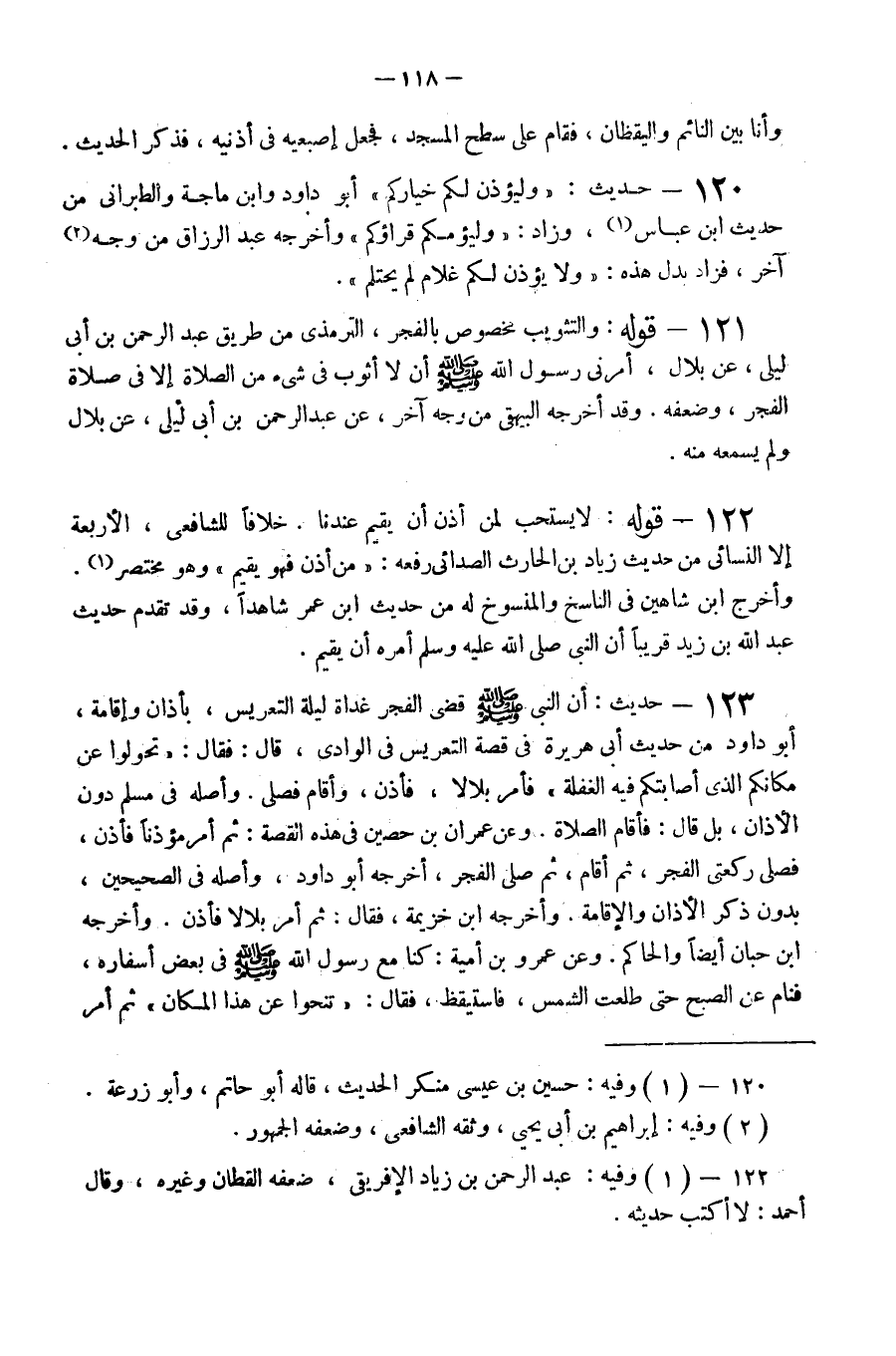 121 - قَوْله والتثويب مَخْصُوص بِالْفَجْرِ التِّرْمِذِيّ من طَرِيق عبد الرَّحْمَن بن أبي لَيْلَى عَن بِلَال أَمرنِي رَسُول الله صَلَّى اللَّهُ عَلَيْهِ وَسَلَّم َ أَن لَا أثوب فِي شَيْء من الصَّلَاة إِلَّا فِي صَلَاة الْفجْر وَضَعفه وَقد أخرجه الْبَيْهَقِيّ من وَجه آخر عَن عبد الرَّحْمَن بن أبي لَيْلَى عَن بِلَال وَلم يسمعهُ مِنْهُ