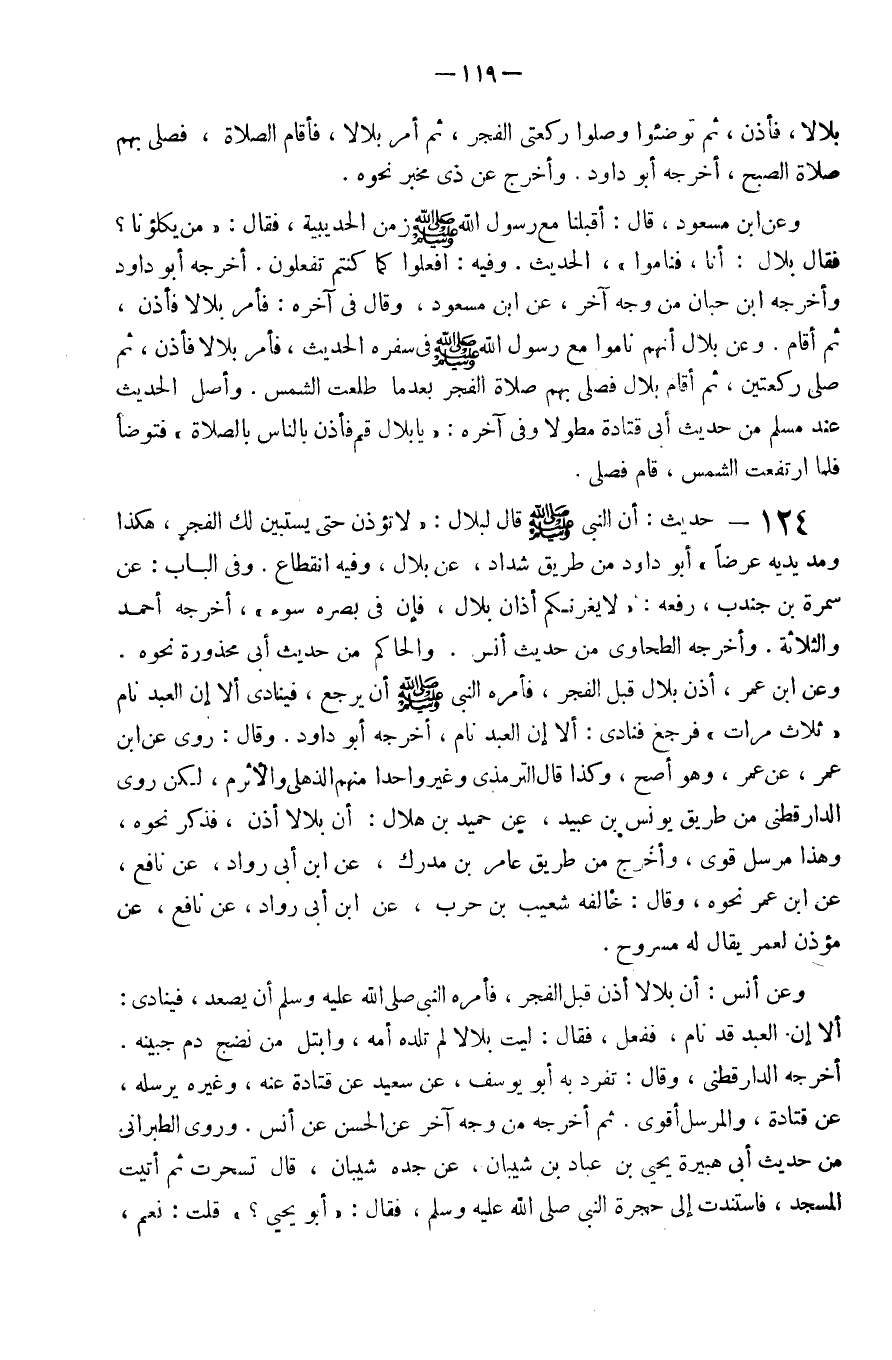 124 - حَدِيث أَن النَّبِي صَلَّى اللَّهُ عَلَيْهِ وَسَلَّم َ قَالَ لِبلَال لَا تؤذن حَتَّى يستبين لَك الْفجْر هَكَذَا وَمد يَدَيْهِ عرضا أَبُو دَاوُد من طَرِيق شَدَّاد عَن بِلَال وَفِيه انْقِطَاع وَفِي الْبَاب عَن سَمُرَة بن جُنْدُب رَفعه لَا يَغُرنكُمْ أَذَان بِلَال فَإِن فِي بَصَره سوء أخرجه أَحْمد وَالثَّلَاثَة وَأخرجه الطَّحَاوِيّ من حَدِيث أنس وَالْحَاكِم من حَدِيث أبي مَحْذُورَة نَحوه وَعَن ابْن عمر أذن بِلَال قبل الْفجْر فَأمره النَّبِي صَلَّى اللَّهُ عَلَيْهِ وَسَلَّم َ أَن يرجع فينادي ألاإن العَبْد نَام ثَلَاث مَرَّات فَرجع فَنَادَى أَلا إِن العَبْد نَام أخرجه أَبُو دَاوُد وَقَالَ رَوَى عَن ابْن عمر عَن عمر وَهُوَ أصح وَكَذَا قَالَ التِّرْمِذِيّ وَغير وَاحِدًا مِنْهُم الذهلي والأثرم لَكِن رَوَى الدَّارَقُطْنِيّ من طَرِيق يُونُس بن عبيد عَن حميد بن هِلَال أَن بِلَالًا أذن فَذكر نَحوه وَهَذَا مُرْسل قوي وَأخرج من طَرِيق عَامر بن مدرك عَن ابْن أبي دَاوُد عَن نَافِع عَن ابْن عمر نَحوه وَقَالَ خَالفه شُعَيْب بن حَرْب عَن ابْن أبي دَاوُد عَن نَافِع عَن مُؤذن لعمر يُقَال لَهُ مسروح